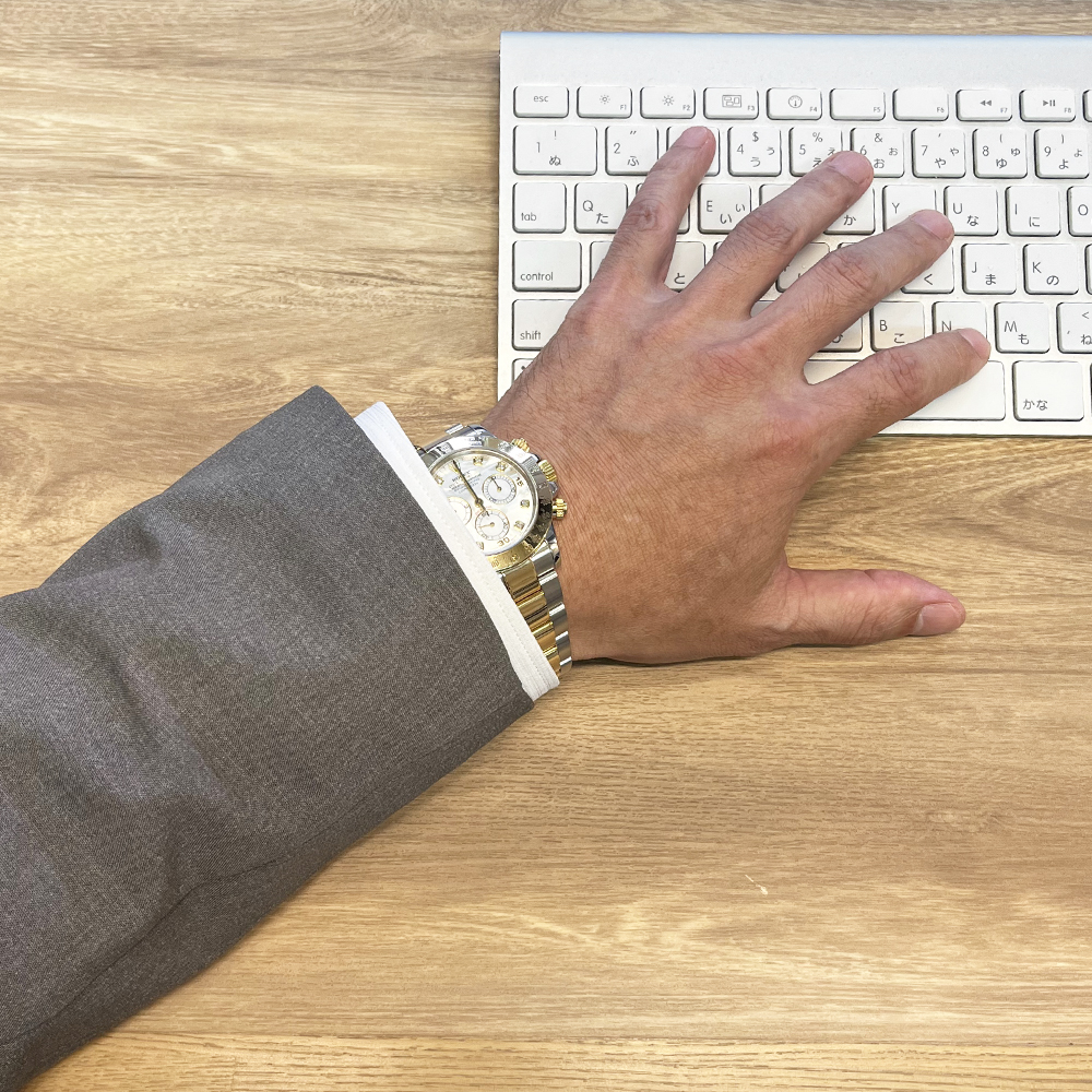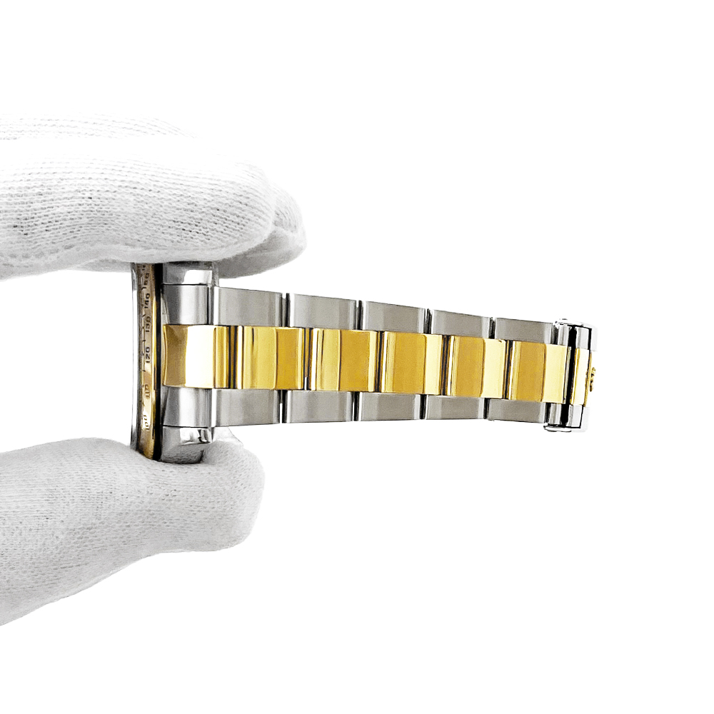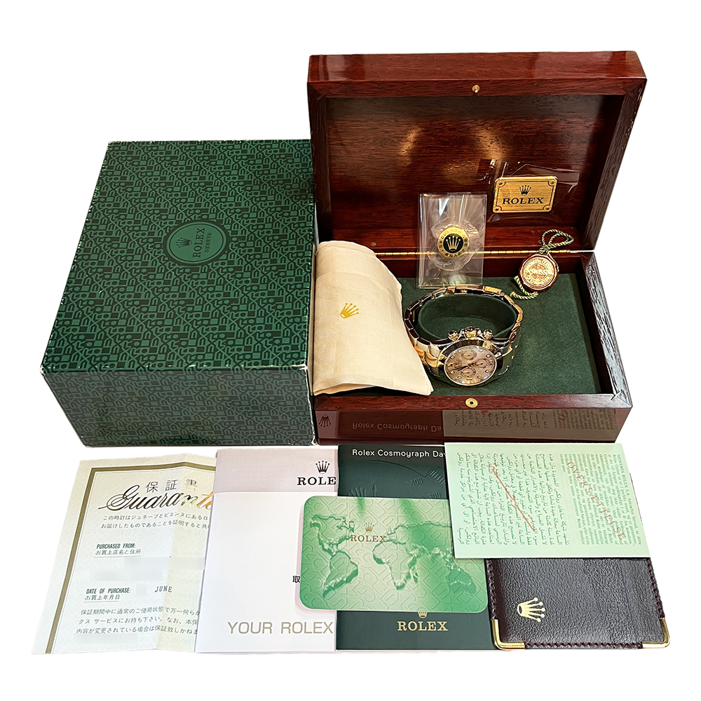 ロレックス デイトナ 116523NG が入荷しました。2000年、ロレックス社悲願の完全自社製クロノグラフ・ムーブメントを搭載し、完全マニュファクチュール化を果たしたデイトナのコンビモデルです。美しいホワイトシェル文字盤には純正のダイヤモンドインデックスが輝き、まさにラグジュアリースポーツと呼ぶに相応しい佇まいです。本品はルーペで拡大して確認すると、ベゼルやブレスレットに微細なキズはございますが、肉眼ではほとんど見えない程度で、目立つ傷のない非常に綺麗な状態です。ギャランティーに2001年6月に国内正規販売店で購入した記載がございます。