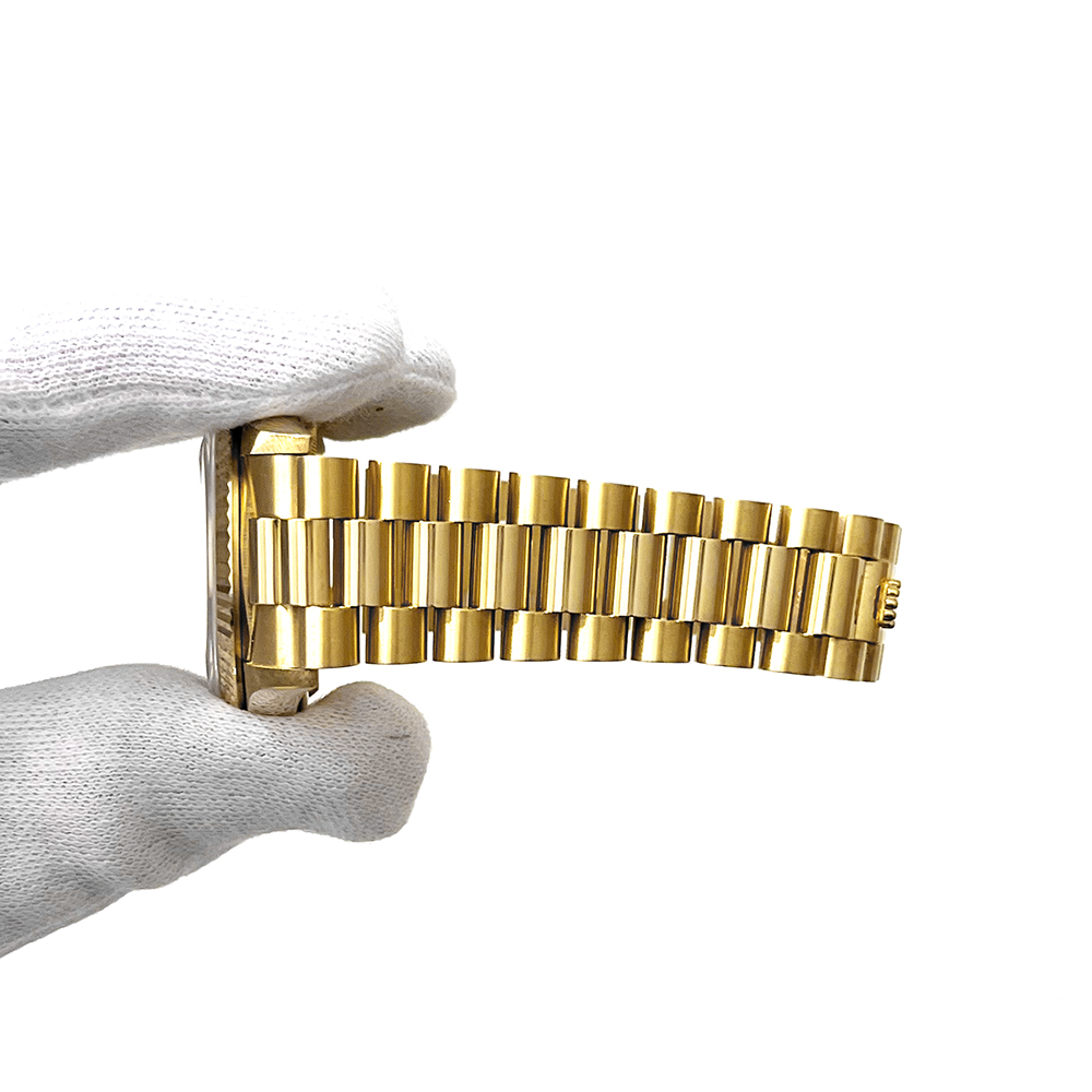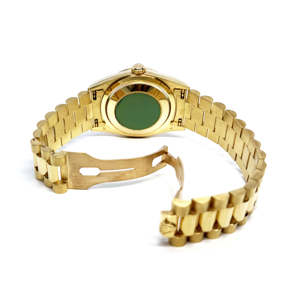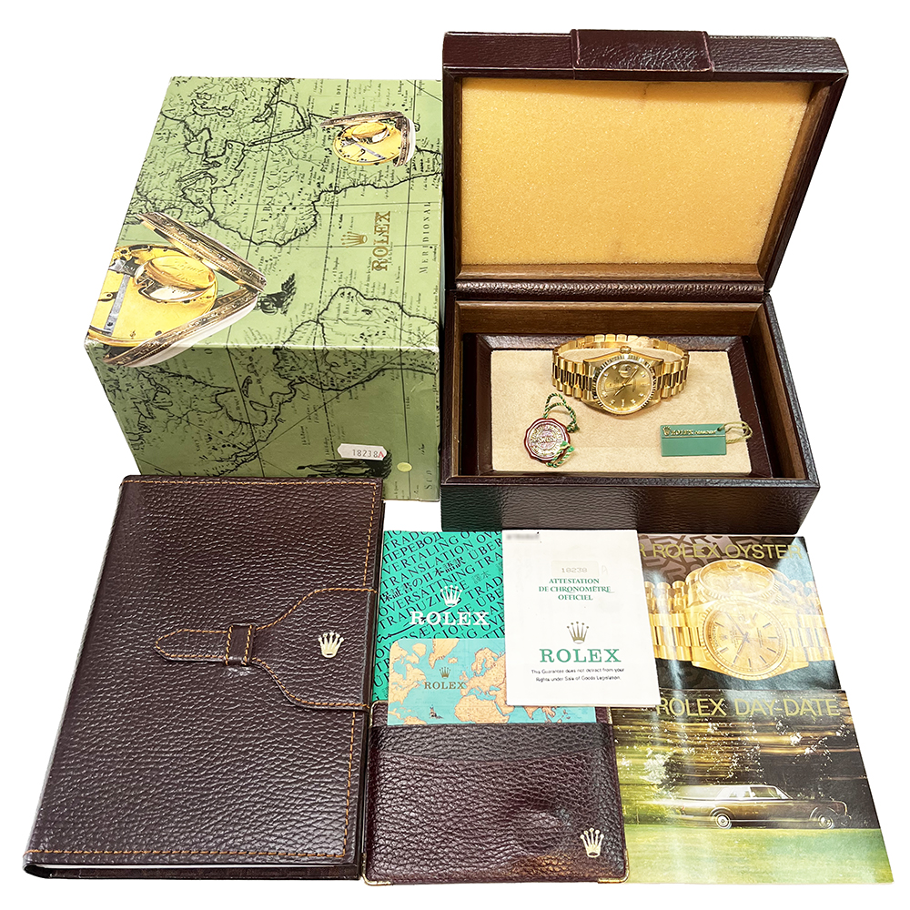 ロレックス デイデイト 18238A が入荷しました。ロレックスで唯一のフルスペルの曜日表示を備えるデイデイトは、手にしたユーザーにワンランク上のステータスと満足感を与えてくれます。腕元に馴染む36mmイエローゴールド無垢のケースは高級感が溢れ、最高峰モデルに相応しい仕上がりです。本品ルーペで拡大して確認すると、針に極々わずかに劣化がみられますが肉眼ではほとんど見えない程度で、特に目立つ傷のない非常にきれいな状態です。ギャランティにイギリスで購入した記載がございます。日付の記載はありません。