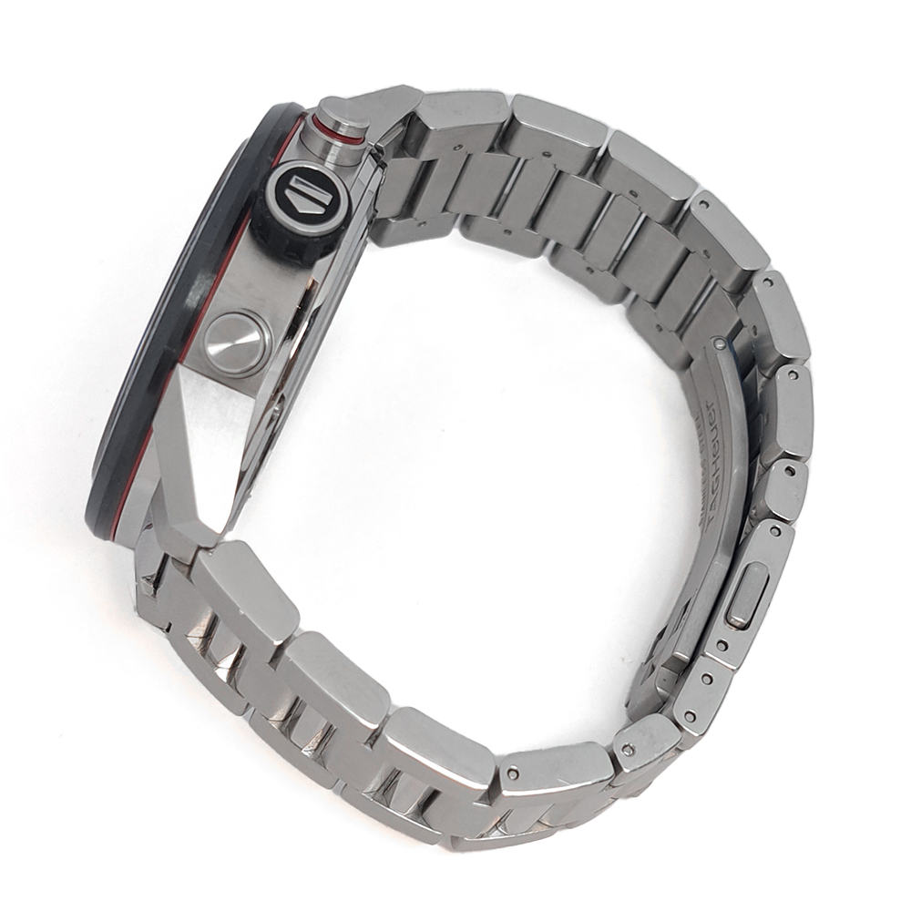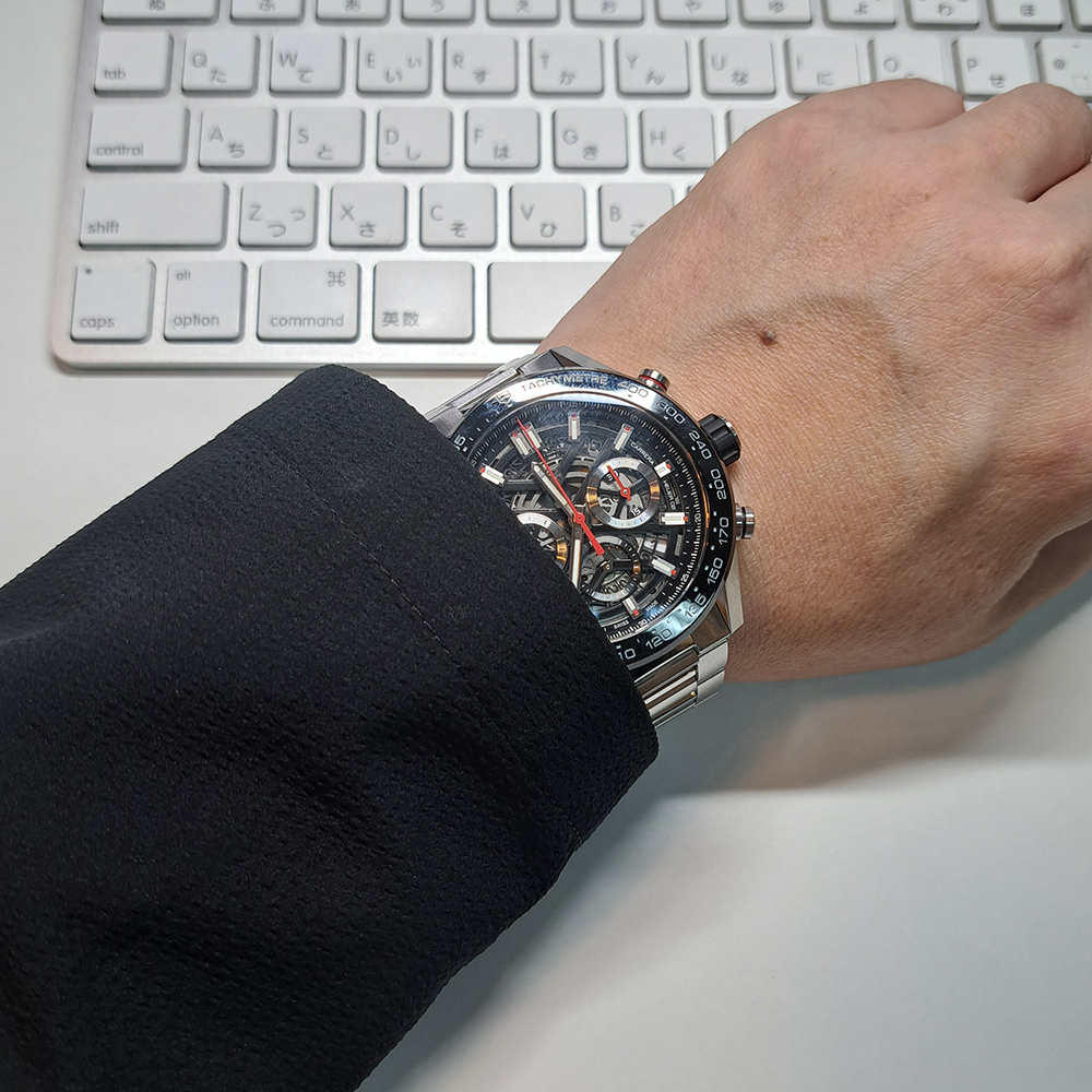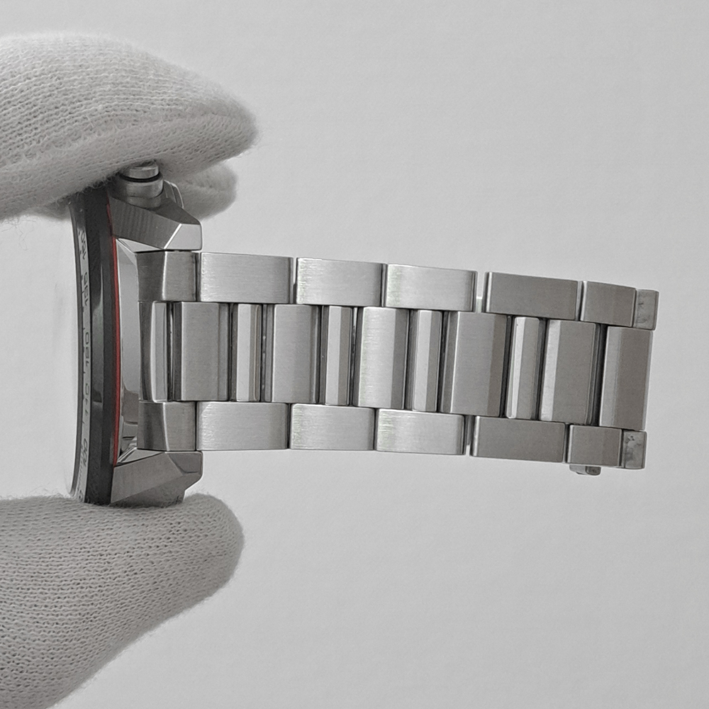 45mmのケースサイズは迫力があり、装着するとずっしりとした重量感も味わえます。ベゼルにブラックセラミックを仕様する事により全体的に引き締まった印象を与えてくれます。