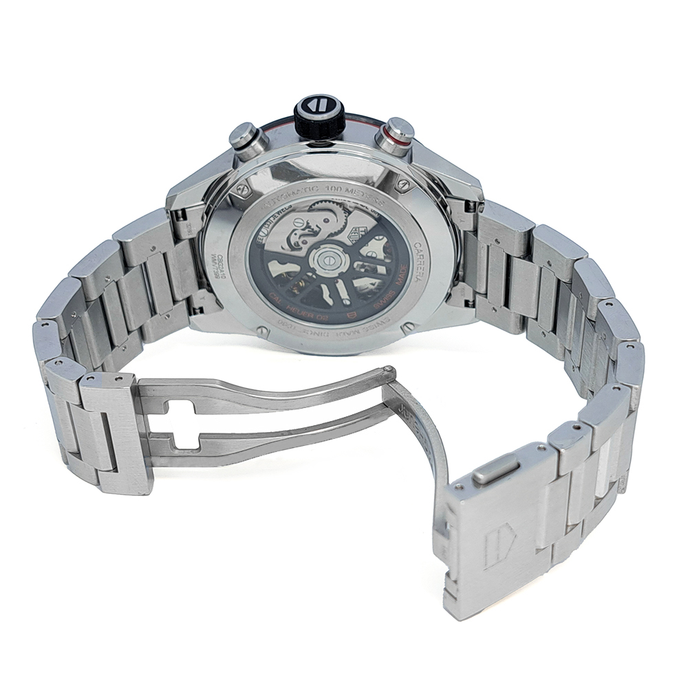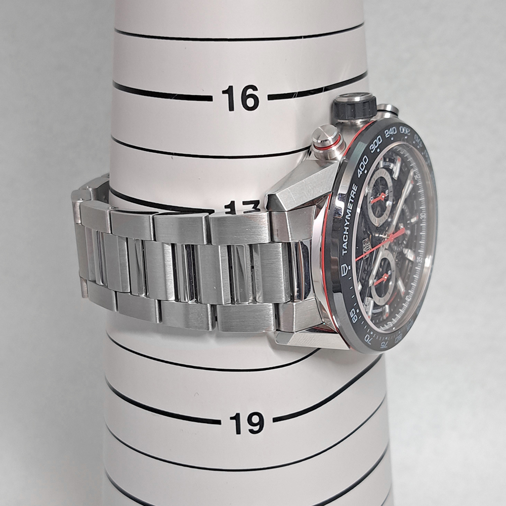 タグ・ホイヤー カレラ CBG2A10 が入荷致しました。タキメーターベゼルには耐傷性・耐久性に優れたブラック・セラミックを採用し、ダイヤルと裏蓋がスケルトンとなっており、自社製ムーブメントであるホイヤー02を鑑賞する事が出来ます。針とインデックスにはスーパールミノバが塗布されており視認性にも優れています。こちらの商品は目立った傷等のない綺麗な状態です。