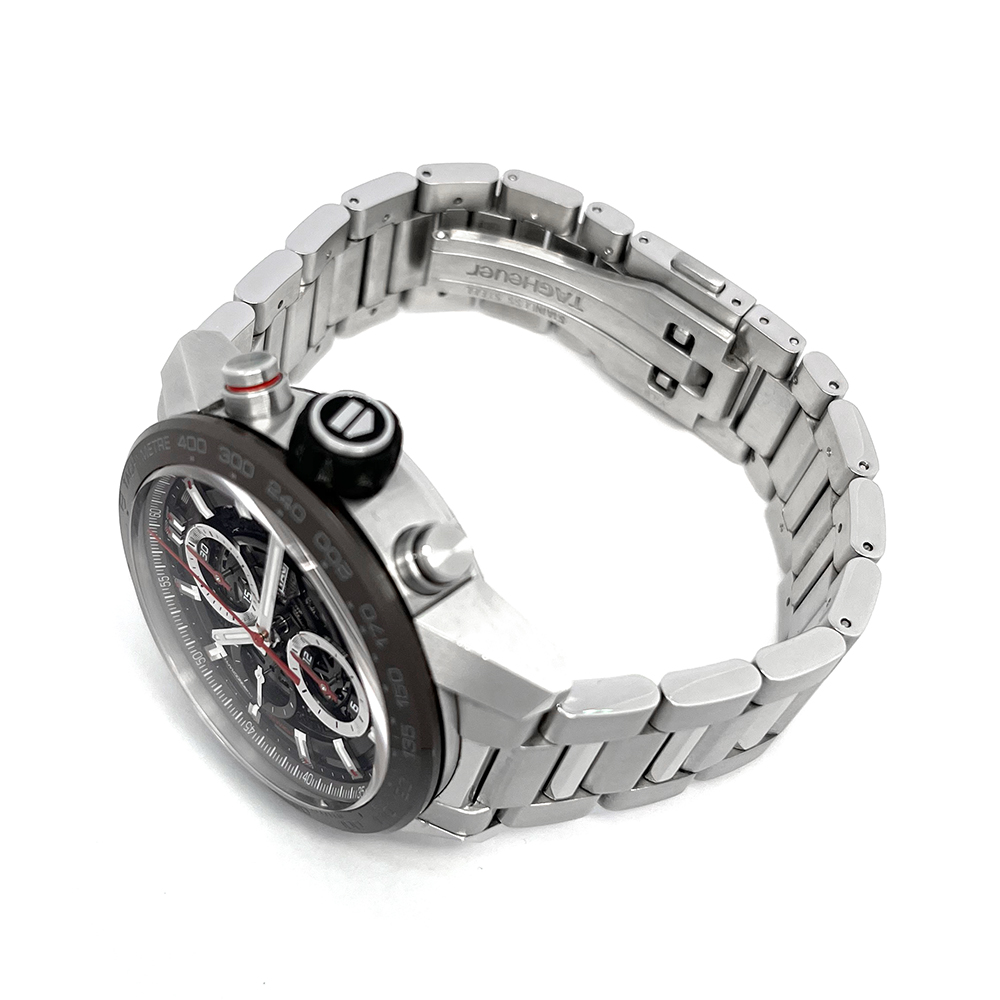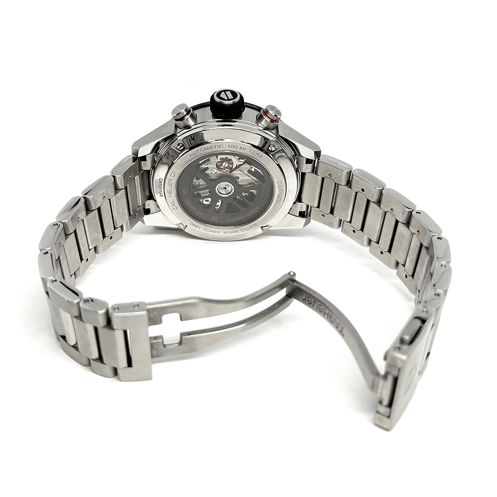 タグ・ホイヤー カレラ CAR201U.BA0766 が入荷しました。これまでのケースサイズより2mm小さくなった43mmケースは腕にしっくりと馴染み、装着感がアップしています。ベゼルには耐傷性に優れたブラウンセラミックを、文字盤のスモールセコンドの枠にもブラウンを使用することで、スポーティーでありながら落ち着いた雰囲気が感じられる1本です。本品はルーペで拡大して確認すると、ケース・ブレスレットに微細なキズはございますが、肉眼ではほとんど見えない程度で、その他目立つ傷のないきれいな状態です。ギャランティに2022年4月に国内正規販売店で購入した記載がございます。