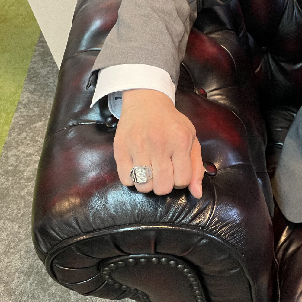 約30グラムのプラチナリングは付けた時の指にずしっとくる重量感が満点です。1カラットUPのラージメレダイヤの輝きがひときわ周囲の目を惹き、ワンランク上のステータスを感じさせてくれます。