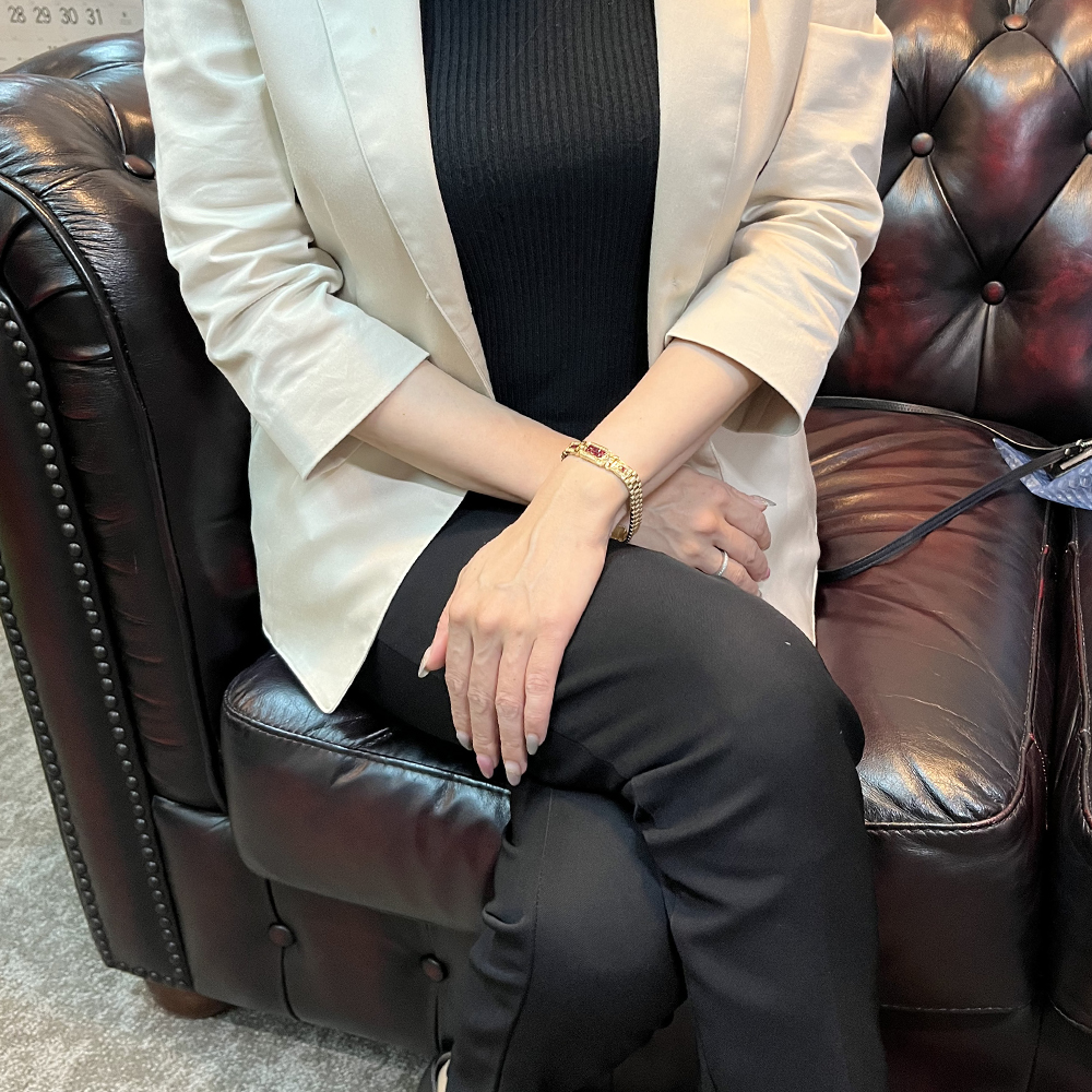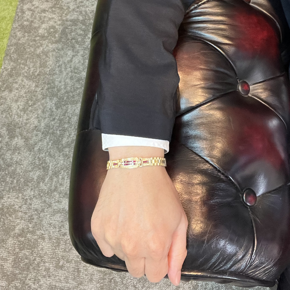 K18 ルビー 1.23ct ダイヤモンド 0.70ct ブレスレット が入荷しました。腕に沿うようにカーブしたプレート部分にルビーとダイヤモンドがセッティングされたエレガントなブレスレットです。金無垢のロレックスを思わせるプレジデントタイプのブレスレットは駒を付け外しすることで腕周りを調整できますので、男性・女性ともにお使いいただけます。