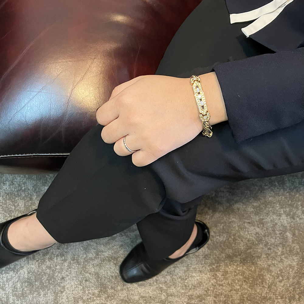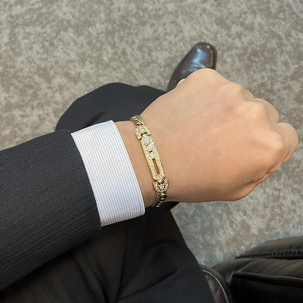 K18 スライド ダイヤモンド 1.024ctをセッティングしたメンズブレスレットが入荷致しました。ブレスレットの中央部分に上質で照りのある3石のダイヤモンドを使用しており、動くたびにスライドしてキラキラと輝き腕元をゴージャスに演出してくれます。