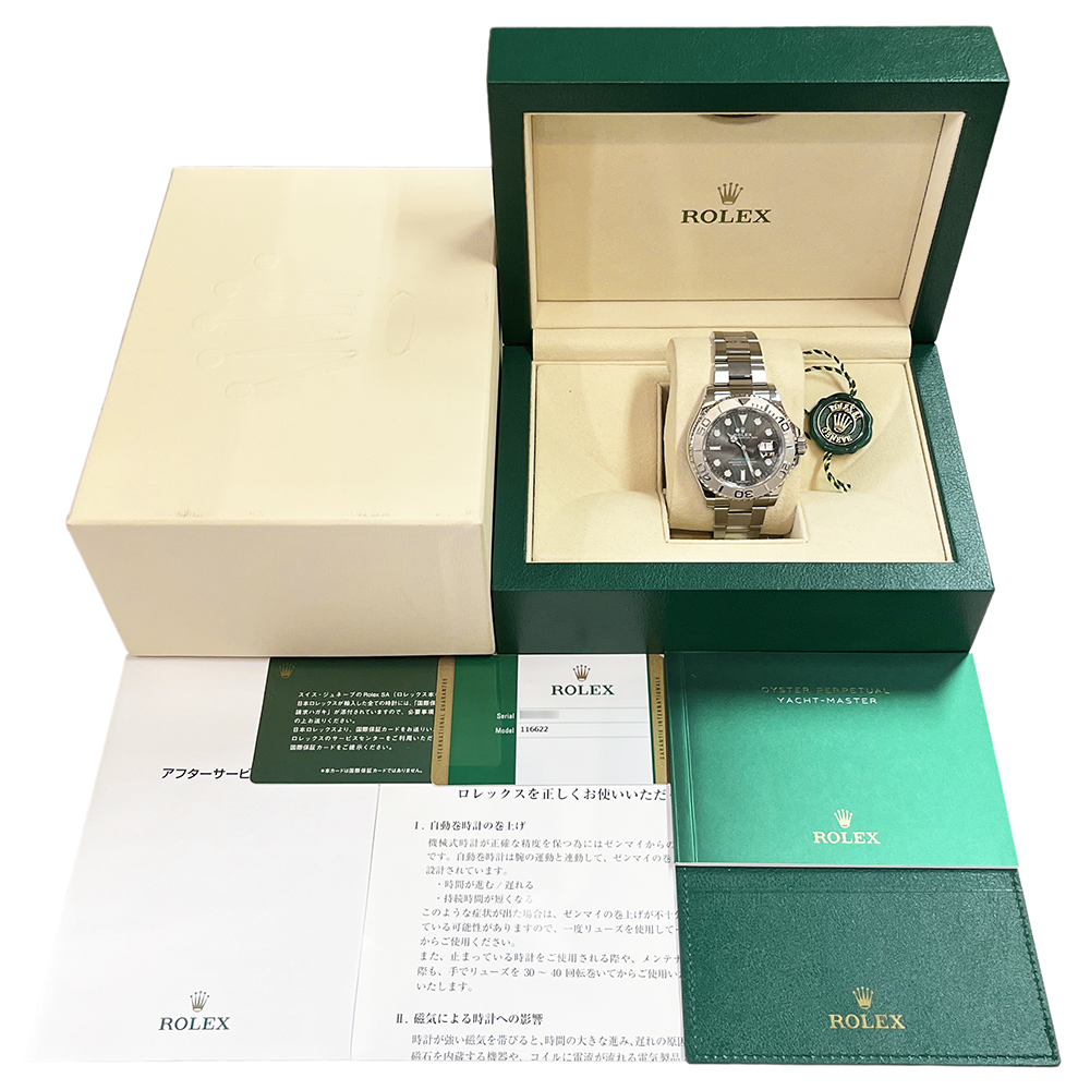 ロレックス ヨットマスター40 116622 ダークロジウム が入荷しました。1992年に誕生したヨットマスターは、サブマリーナの高級仕様として、クルージングでバカンスを楽しむ富裕層向けをコンセプトに開発されたモデルです。ダークロジウム文字盤のRef.116622は2016年〜2019年のわずか4年間ほどで後継機Ref.126622の登場により生産終了となったことで、個体数はそれ程多くないモデルです。本品はベゼルに極微細なスレがありますが、肉眼ではほとんど見えない程度で他にも目立つ傷のない非常に綺麗な状態です。ギャランティーに2018年8月に国内正規販売店で購入した記載がございます。