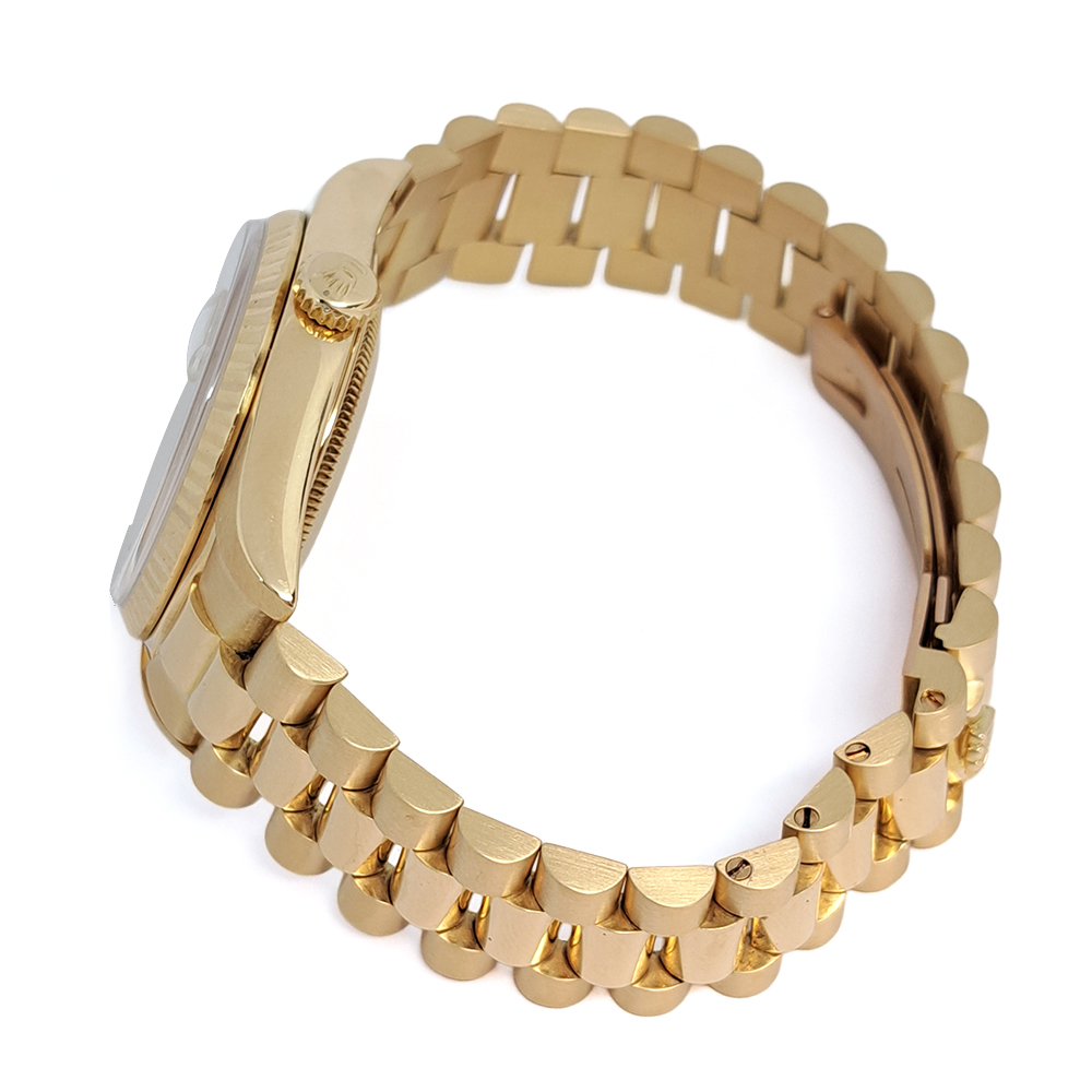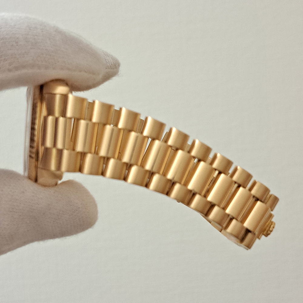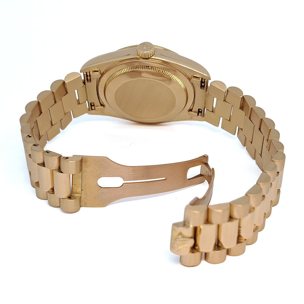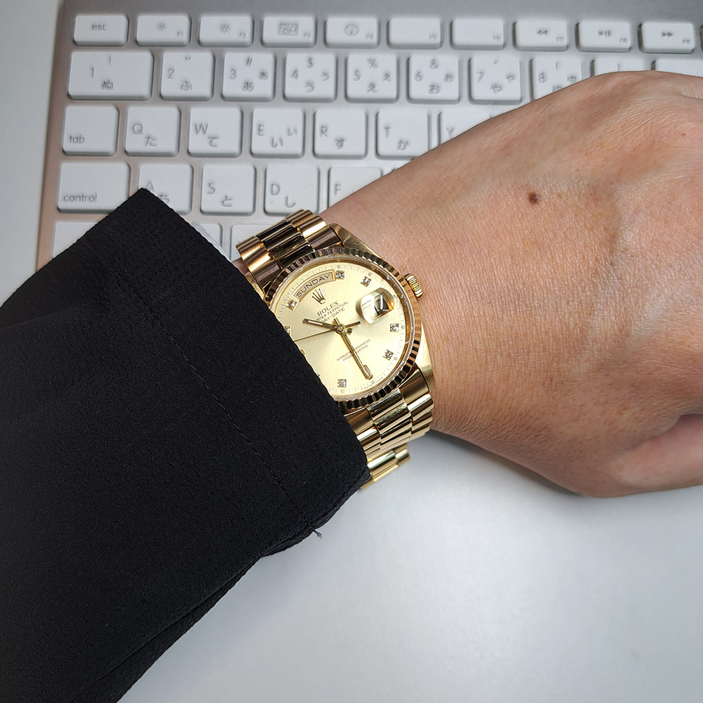 ロレックス デイデイト 18238A が入荷致しました。金無垢素材にダイヤルには8P純正ダイヤと2Pのバケットダイヤをセッティングしたロレックスの最高級モデルです。こちらの商品はルーペで拡大すると風防ガラスに微細なカケが御座いますが、肉眼ではそれ程気にならない程度で、それ以外は目立った傷等の無い綺麗な状態です。2025年10月に当店提携工房にてオーバーホールを実施しており、安心してご使用して頂けます。