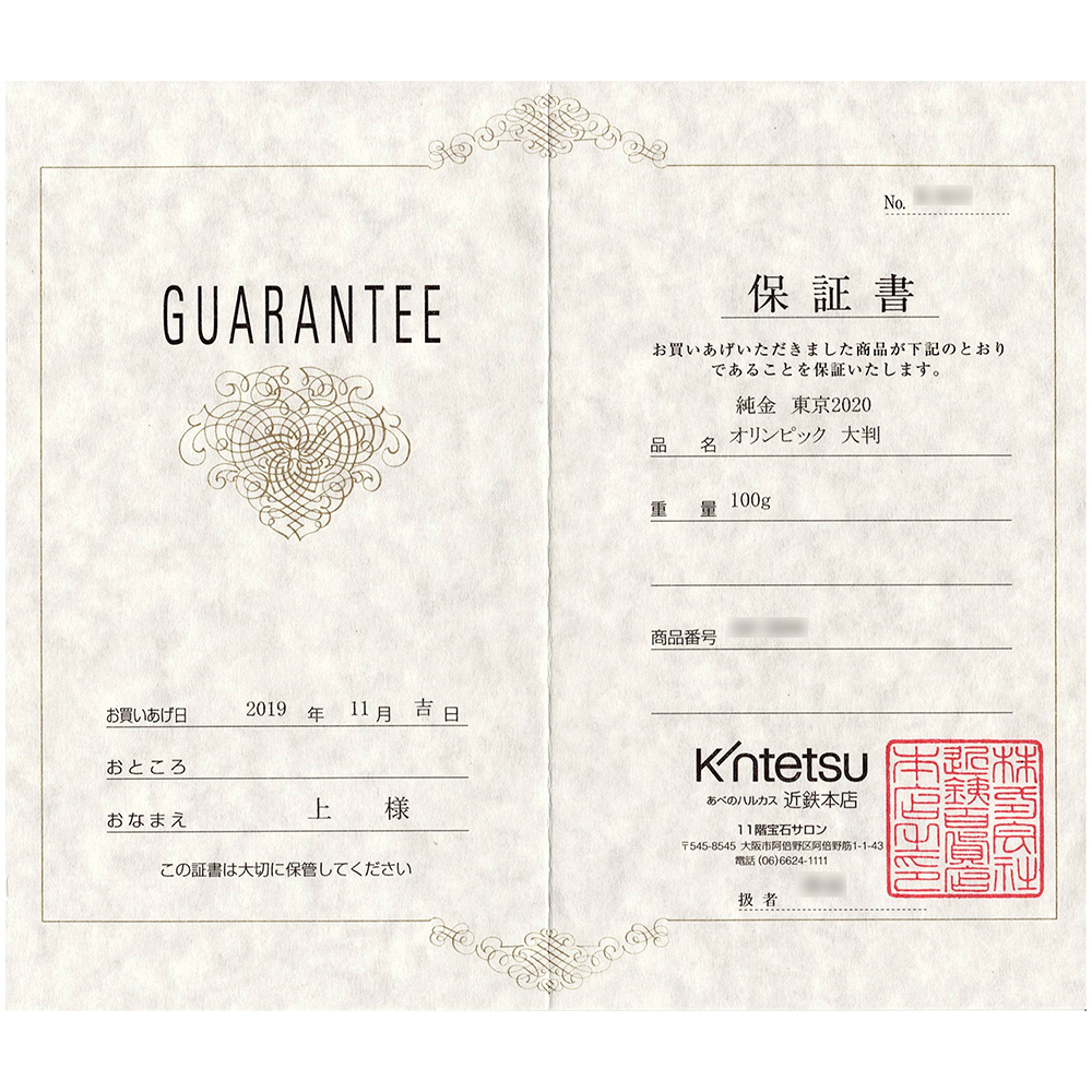 K24 純金製 100g 東京2020 公式 オリンピックエンブレム ミライトワ 大判