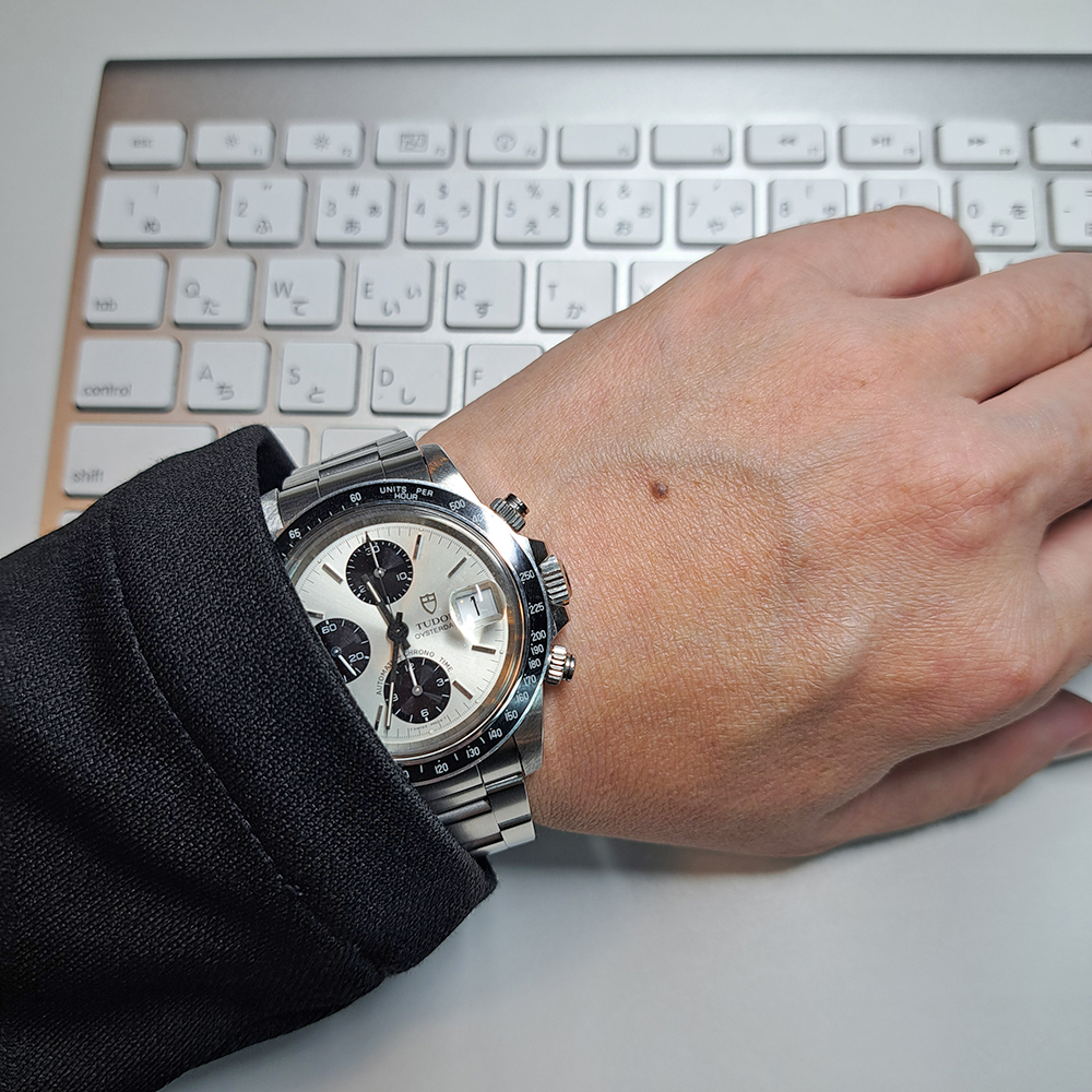 チューダー 79160 クロノタイム シルバーが入荷致しました。クロノタイム 第2世代 後期モデルである79160、分厚いかまぼこ型のケースが特徴で、ケースとリューズはロレックスの4桁リファレンスのデイトナと同じものが使用されていることもあり、文字盤のデザインこそ異なりますが、最もヴィンテージデイトナの面影を感じさせてくれるお品です。こちらの商品はルーペで拡大するとケース、風防等微細な小傷は御座いますが、肉眼ではそれ程気にならない程度です。ギャランティに1994年3月にドイツにて購入した記載があります。