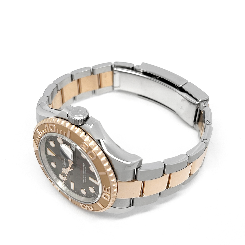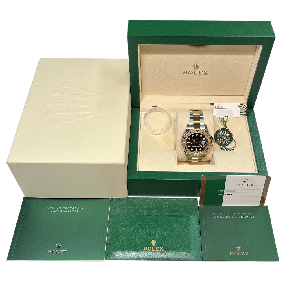 ロレックス ヨットマスター 116621 チョコレート が入荷しました。このモデルはステンレスとエバーローズゴールドの初めてのコンビモデルとして2016年に発表され、ロレックスファンの間で大いに盛り上がりました。2019年には後継機Ref.126621が発表され製造終了になった比較的販売期間の短いモデルです。本品はルーペで拡大して確認すると、使用による微細なキズはありますが肉眼ではほとんど見えない程度で、目立つ傷のない非常にきれいな状態です。ギャランティに2018年3月にベルギーで購入した記載がございます。