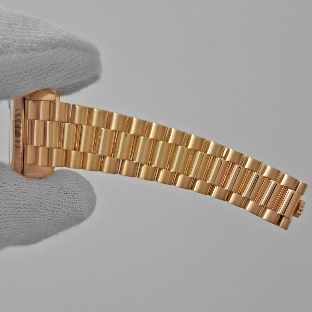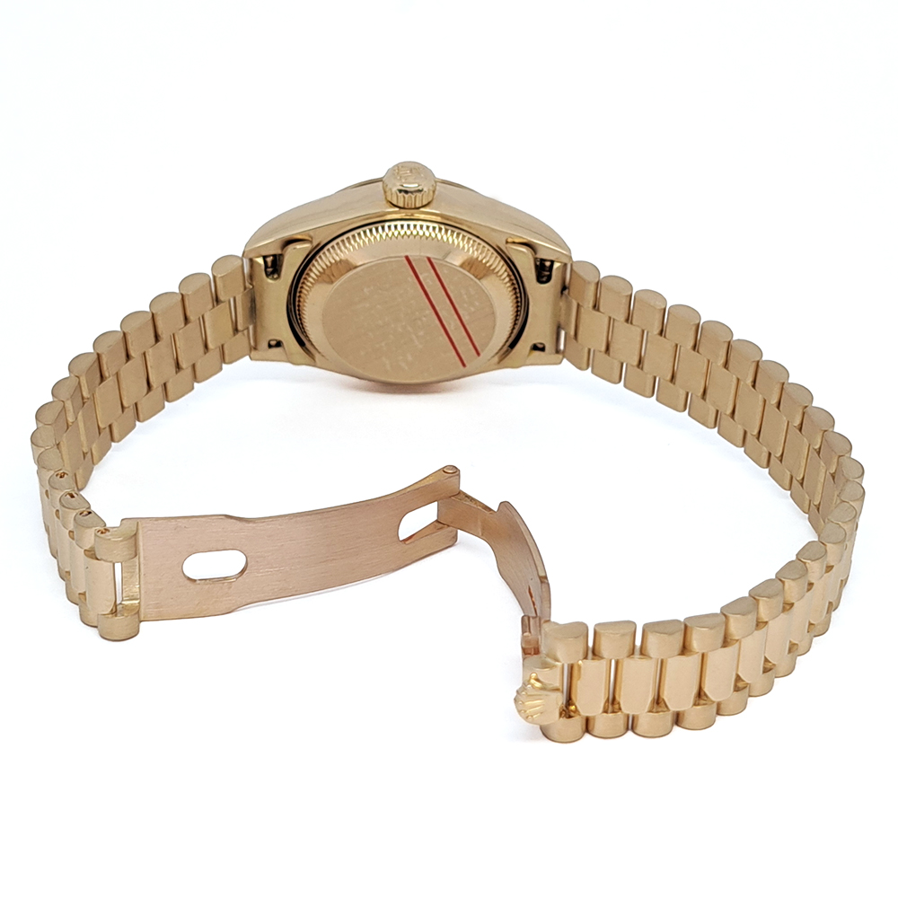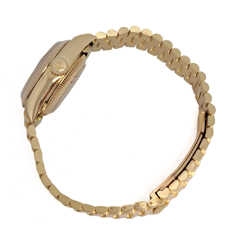 まばゆい華やかさを演出するイエローゴールドのケースに、ダイヤインデックスとシャンパンカラーのダイヤルの組み合わせが、ワンランク上のラグジュアリー感を演出しています。金が高騰し続けている今が購入のチャンスです。