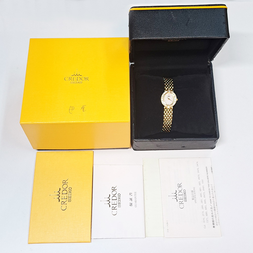 セイコー クレドール GTAP972 金無垢が入荷致しました。美しいオパールダイヤルに純正ダイヤベゼルをセッティングしたゴージャスな逸品でSEIKOの頂点ブランド「クレドール」ならではの卓越した技術と想いが腕時計から伝わってきます。こちらの商品は目立った傷等の無い綺麗な状態です。ギャランティに2000年3月に国内正規販売店にて購入した記載があります。