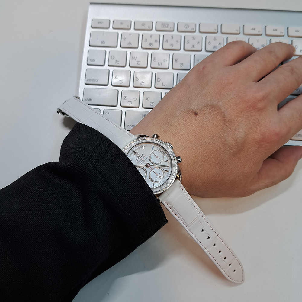 美しいシェルダイヤルとダイヤモンドベゼルが特徴的なモデルで、秒針・インダイヤルの針(2カ所)・スピードマスターのロゴが淡いピンク色に塗装されており、さり気ない所までお洒落な逸品です。