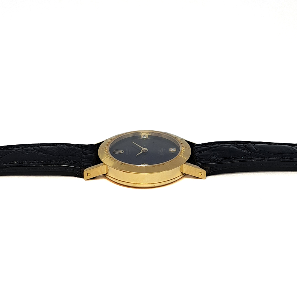 ロレックス チェリーニ 4081 YG無垢 が入荷致しました。金無垢素材にブラックダイヤルと3P純正ダイヤモンドをセッティングしたゴージャスかつなっかしさを感じさせてくれるモデルです。2025年10月に当店提携工房にてオーバーホールを実施しており、安心してご使用して頂けます。こちらの商品はベルトには若干の使用感はありますが、ご使用には問題ございません。それ以外は目立った傷等も無く綺麗な状態です。