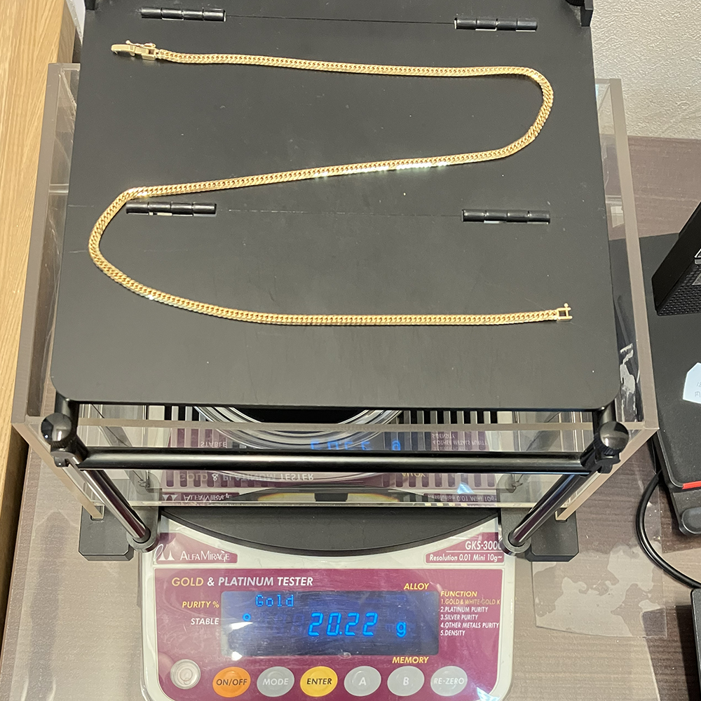 K18検定マーク付、20.22gの6面ダブル喜平ネックレスです。