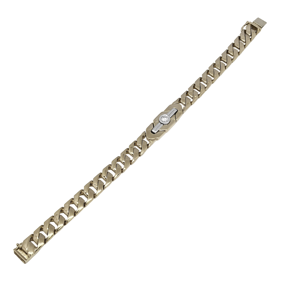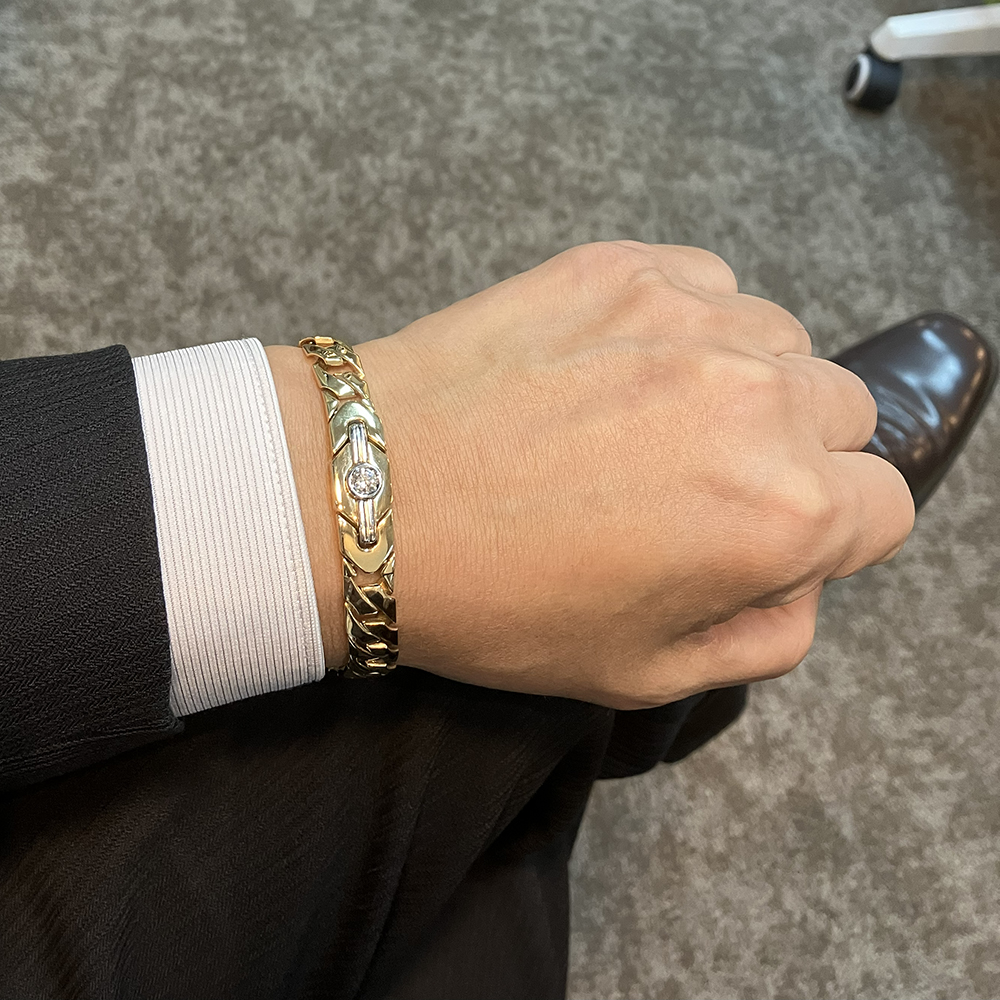 イエローゴールドのブレスレットに主石のダイヤモンドが煌めき手元を豪華な装いにしてくれます。太すぎず細すぎないタイプですので普段使いにもおすすめの一品です。