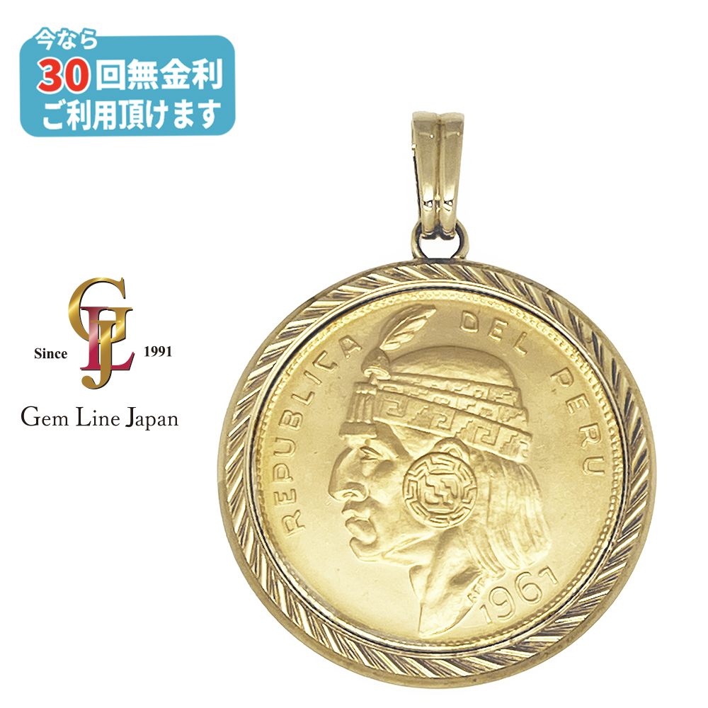 ペルー造幣局発行 インカ インディアン 金貨 コイン トップが入荷しました。 表面にインカ王の左向き頭像、裏面にインカン・ディアティと呼ばれる神様の像を描いた金貨を使用しイエローゴールドの枠で留めたコイントップです。