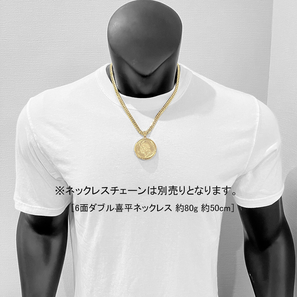 本金貨の発行同時期に同額で別デザイン(女神座像)の金貨が発行されておりますが、本金貨のほうが金の含有量が多い為、関係者向けに発行された希少価値のある金貨になります。装着するとシンプルですが大型の金貨がキラキラと輝き胸元をお洒落に演出してくれます。※装着写真のチェーンは別売です。80g・50cmの6面ダブル喜平ネックレスを使用しています。バチカンは別途料金にて加工も承っており大きくする事も可能です。お気軽にお問合せくださいませ。