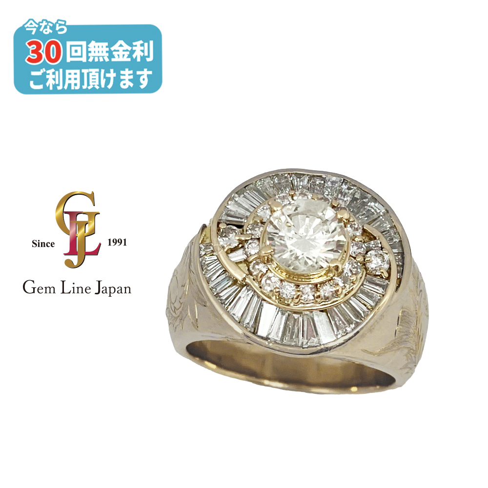 K18 ダイヤモンド メンズリングが入荷しました。輝きの良い一粒ダイヤモンド 1.064ctをセンターにセットし、周囲に渦巻き型にバゲットカットのダイヤモンドを使用した豪華なメンズリングです。