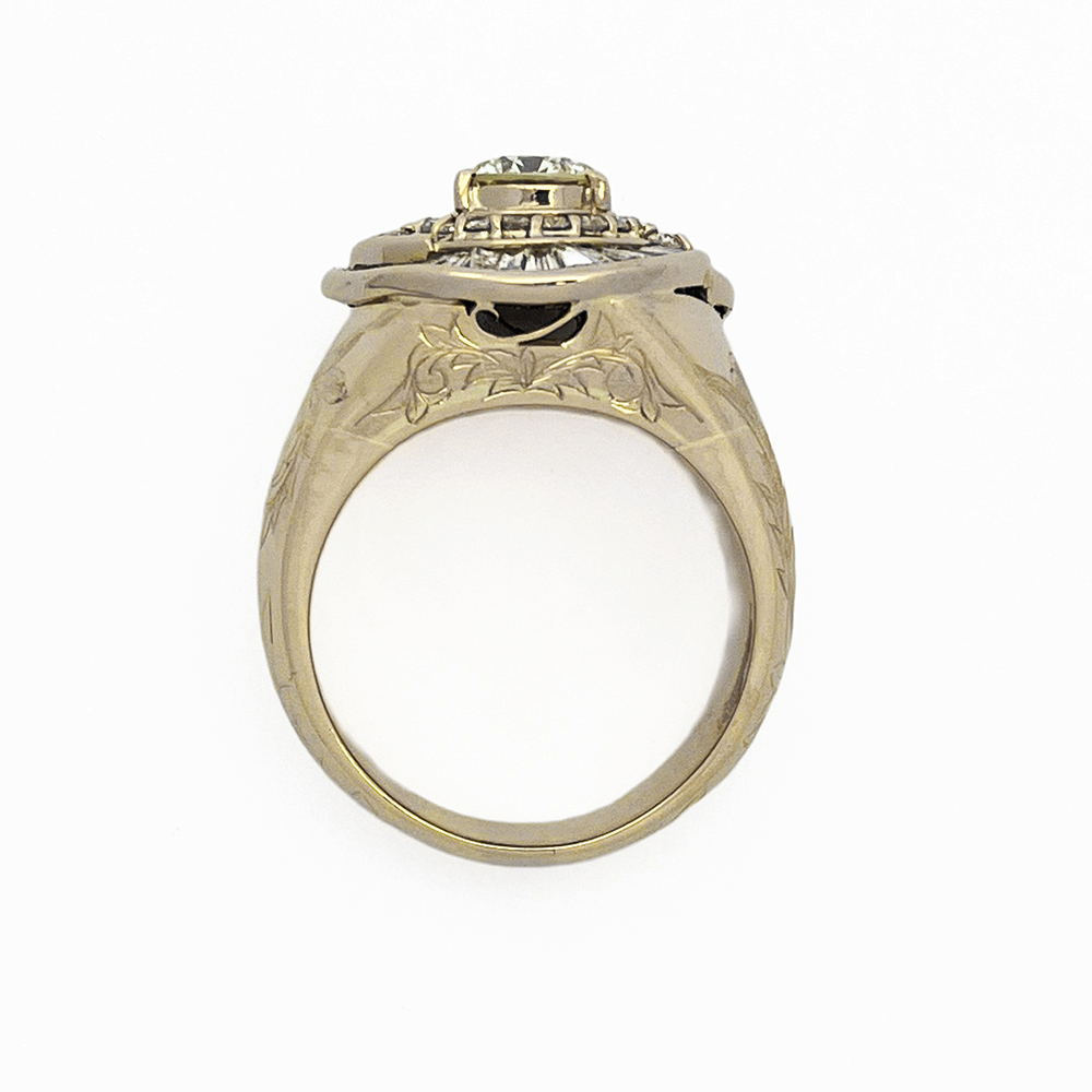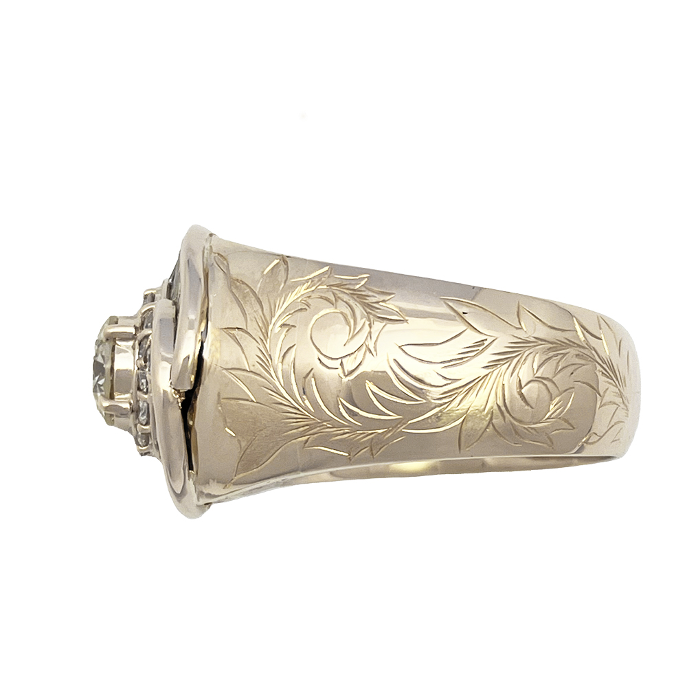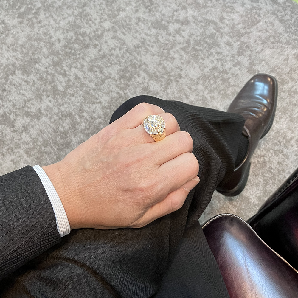 イエローゴールドの輝きと、きらきらと輝くダイヤモンドが手元を豪華に演出してくれます。リング側面と上部にには唐草模様のデザインが彫られています。指通りもなめらかで着け心地も最高です。男性のオシャレをワンランクアップしてくれるジュエリーです。