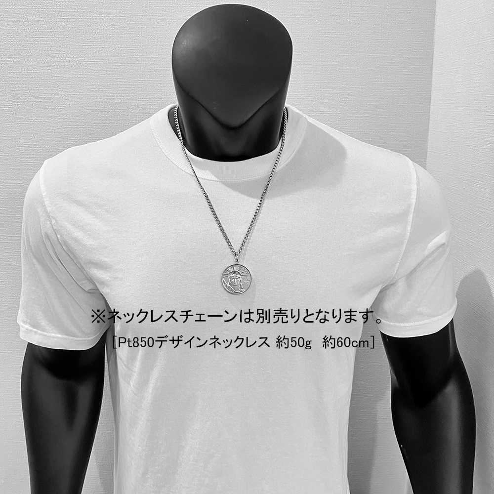 プラチナ貨は現在購入出来づらい状況となっています。イーグルコイン自体も流通量が少なくとても貴重な一品です。 装着すると胸元に男性らしい印象を演出してくれます。※装着写真のチェーンは別売です。50g・60cmのPt850デザインネックレスを使用しています。バチカンは別途料金にて加工も承っており大きくする事も可能です。お気軽にお問合せくださいませ。