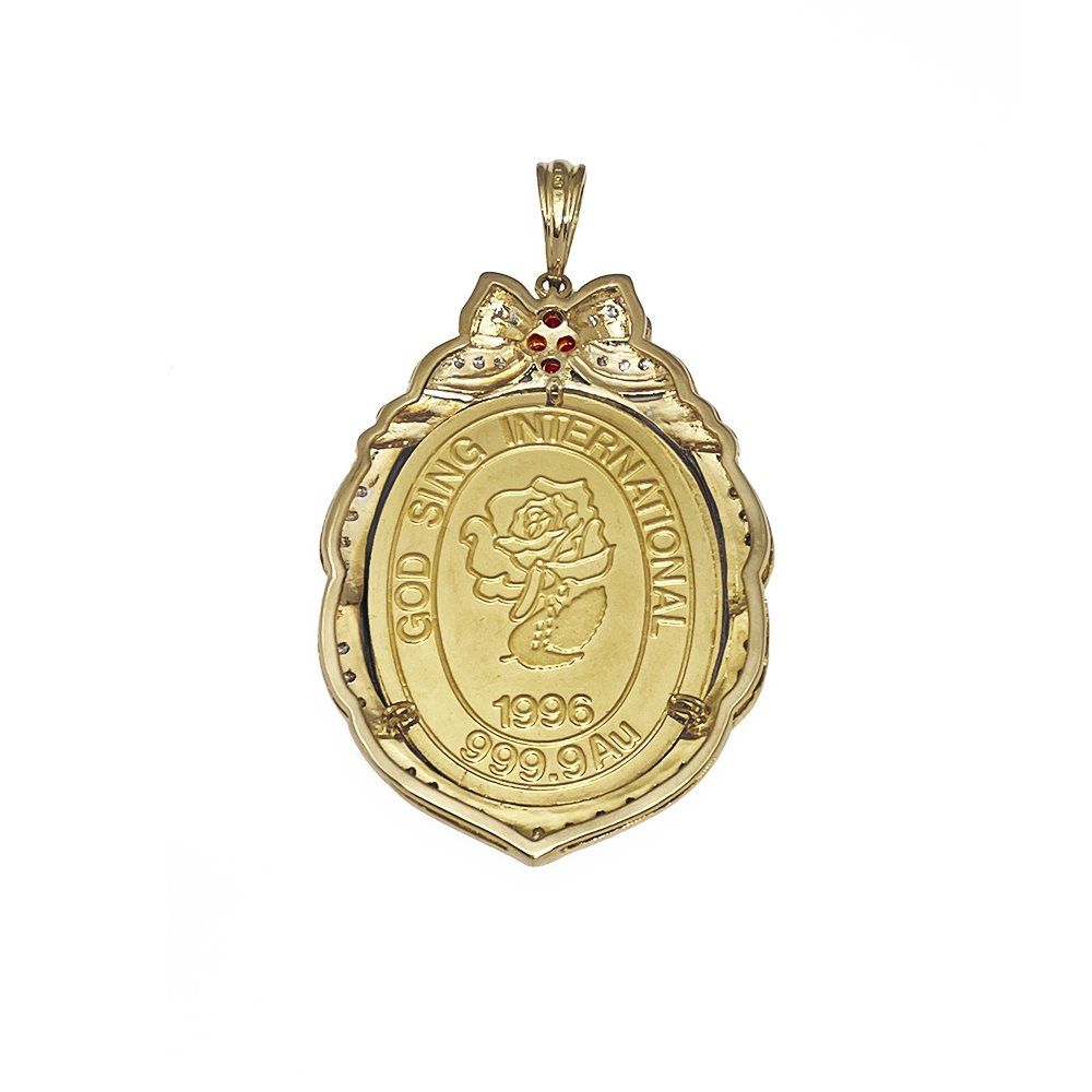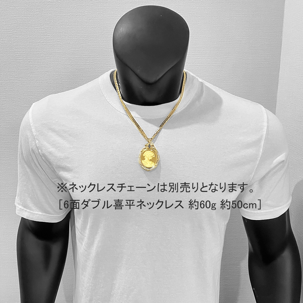 枠の上部にルビー、周囲にダイヤモンドがセッティングされており、装着すると胸元を豪華に演出してくれます。女性の方にもご使用いただけます。※装着写真のチェーンは別売です。60g・50cmの6面ダブル喜平ネックレスを使用しています。バチカンは別途料金にて加工も承っており大きくする事も可能です。お気軽にお問合せくださいませ。