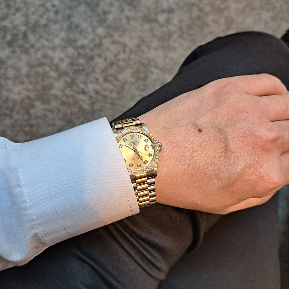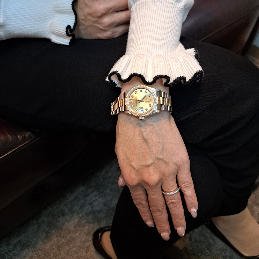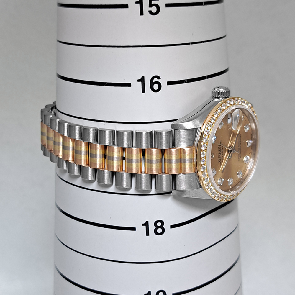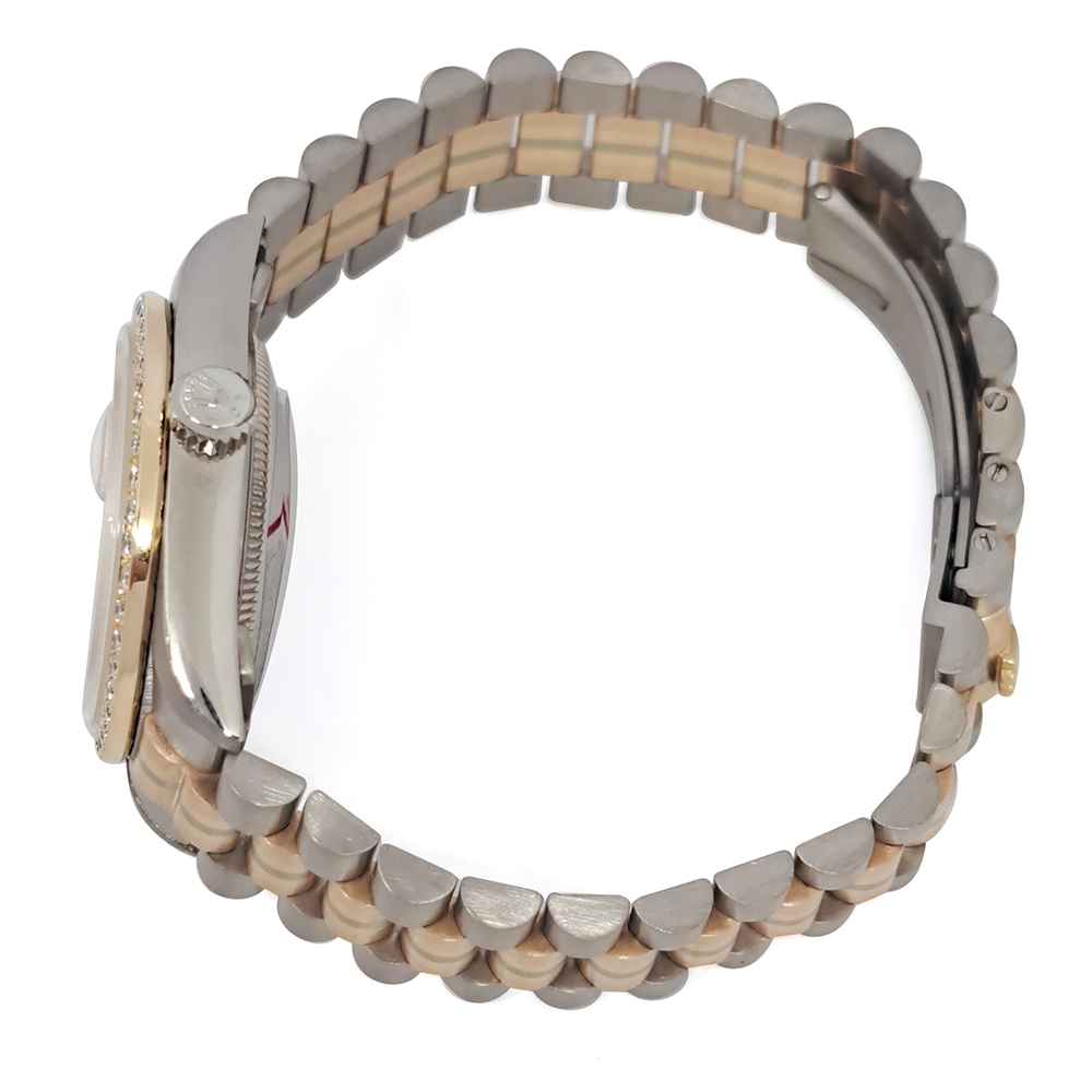 ロレックス デイトジャスト 68289G BIC トリドールが入荷致しました。シャンパンゴールドの文字盤には10P、さらにベゼルにも一周、純正ダイヤモンドを施した高級感のある時計です。ブレスレットにはイエローゴールド、ホワイトゴールド、ピンクゴールドの3種類のゴールドを仕様されて珍しいタイプのブレスレットとなっております。こちらの商品はルーペで拡大すると風防ガラスに微細なカケが御座いますが、肉眼ではそれ程気にならない程度で、それ以外は目立った傷等の無い綺麗な状態です。