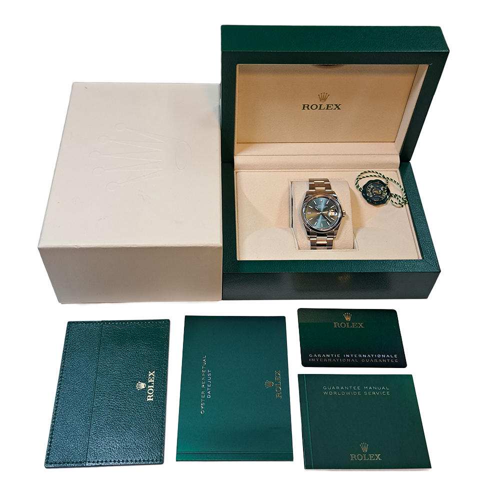 ロレックス デイトジャスト 126200 ミントグリーンが入荷致しました。サンレイ仕上げされた美しい深味のあるミントグリーンダイヤルが特徴的なモデルで、こちらは堅牢でスポーティーな雰囲気を醸し出しているオイスターブレスの逸品です。ギャランティに2024年に購入した記載があります。こちらの商品は、目立った傷等の無い非常に綺麗な状態で、ほとんど使用感の無い綺麗な状態です。