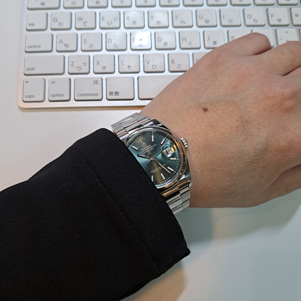 ステンレスにミントグリーンのダイヤルの色彩が良くマッチしていて、いろんな洋服に合わせて頂けます。36mmのケースサイズは、少し大きめサイズがお好みの女性の方でも良く似合うデザインとなっております。