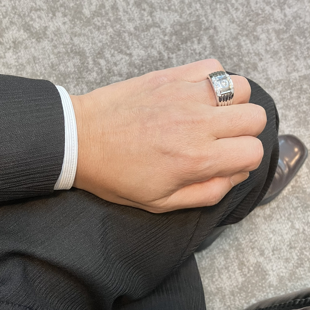 装着すると重厚感があり、腕部にラインが入っているのでシャープさも兼ね備えたリングです。デザインもシンプルですので普段用としても使えます。
