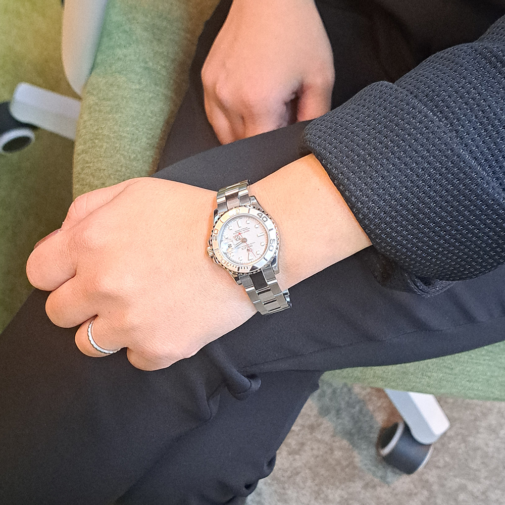 スポーティーな印象を受けますが、全体を同系色で纏めていますので、ビジネスシーン等にも活躍してくれます。ロレジウムダイヤルに赤の秒針とヨットマスターのロゴが良く映えるエレガントな逸品です。