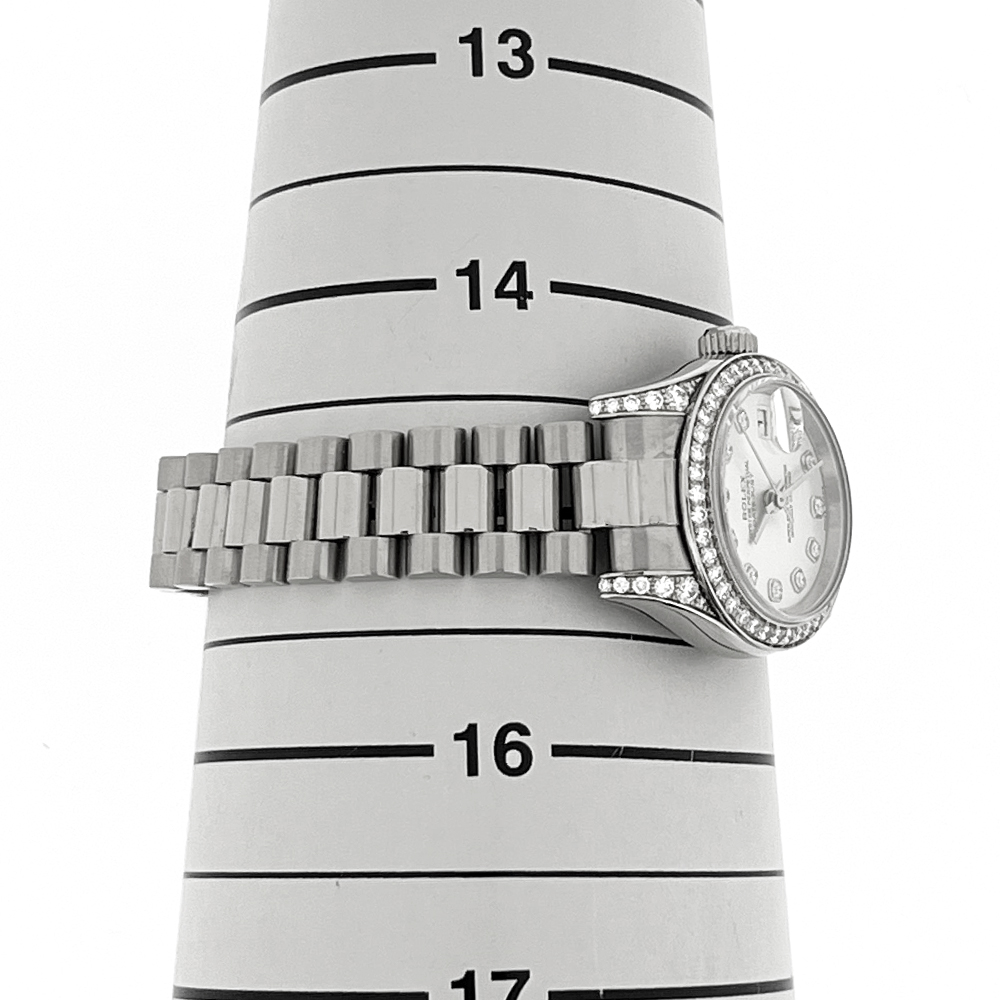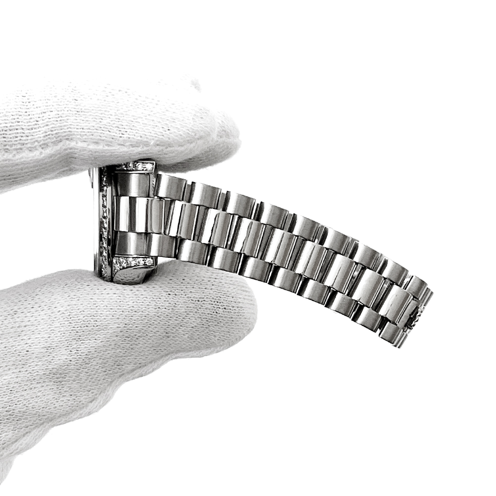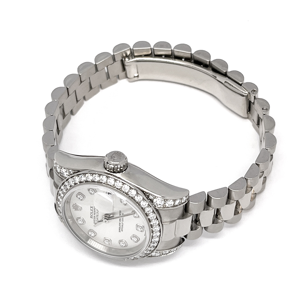 ロレックス デイトジャスト 179159G が入荷しました。ドレスウォッチのアイコン的存在として抜群の知名度を誇るレディ デイトジャスト。 現行モデルの発表とともに惜しまれつつも生産終了となったこちらの26mmサイズは現在でも根強い人気を誇るレディースサイズです。 こちらのモデルはインデックス・ベゼル・ラグまで贅沢にダイヤモンドをセッティングした豪華な1本です。本品はルーペで拡大して確認すると、風防ガラスに極微細な欠けが複数ありますが、肉眼ではほとんど見えない程度で視認性に問題ありません。ケース・ブレスレットに目立つ傷はなく非常にきれいな状態です。カレンダー10分早く切り替わります。