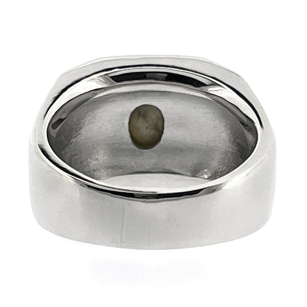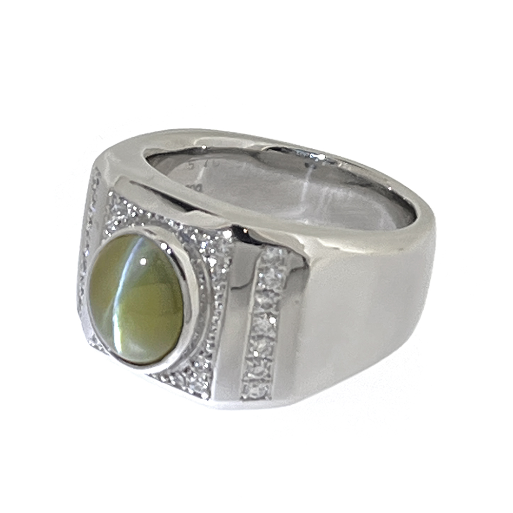 とても丁寧な仕上がりのリングは指通り滑らかで、重量感がありつつも非常にバランスの良い形状です。ふっくらとした蜂蜜色の金緑石の中央を、くっきりと走る乳白色の光の帯をお楽しみください。