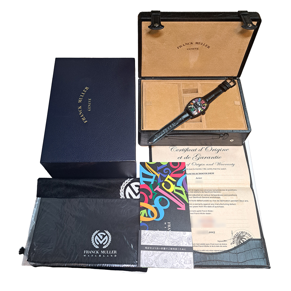 フランクミュラー ブラッククロコ 8880SC BLK CRO カラードリームが入荷致しました。ケース・文字盤はクロコダイルの竹符模様を繊細に作り込まれ、クロコダイルが秘める迫力を見事に表現されており、インデックスはカラフルなビザン数字が採用されています。ギャランティに2015年に国内正規販売店にて購入した記載があります。こちらの商品は目立った傷等の無い綺麗な状態です。