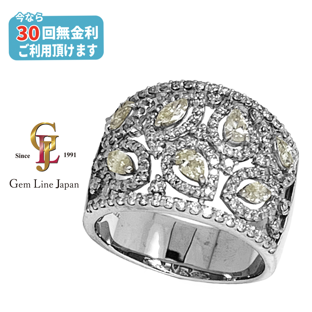 ダイヤモンド 1.50ct プラチナ リングが入荷しました。主石にベリーライトイエロー色でマーキスカットとペアシェイプカットの上質なダイヤを7石セットし、周囲にメレダイヤが豪華に輝くプラチナリングです。