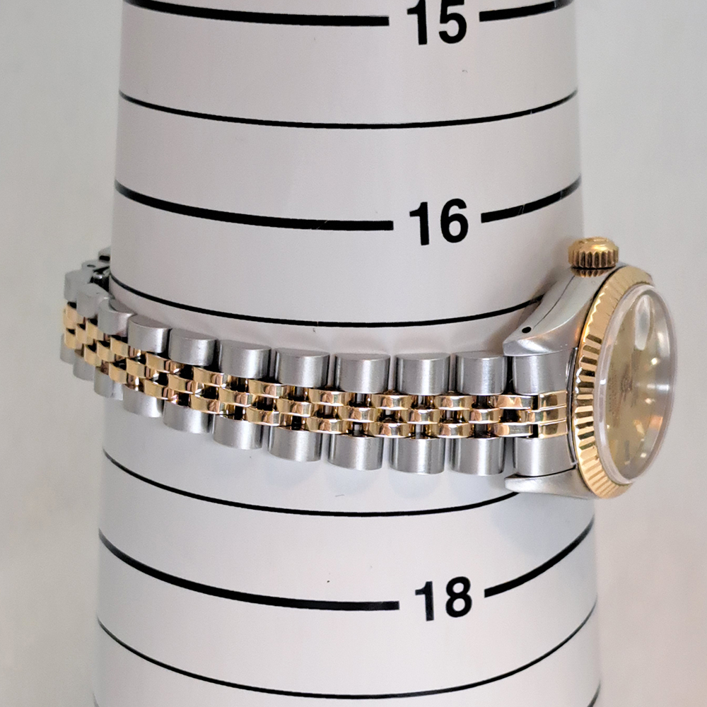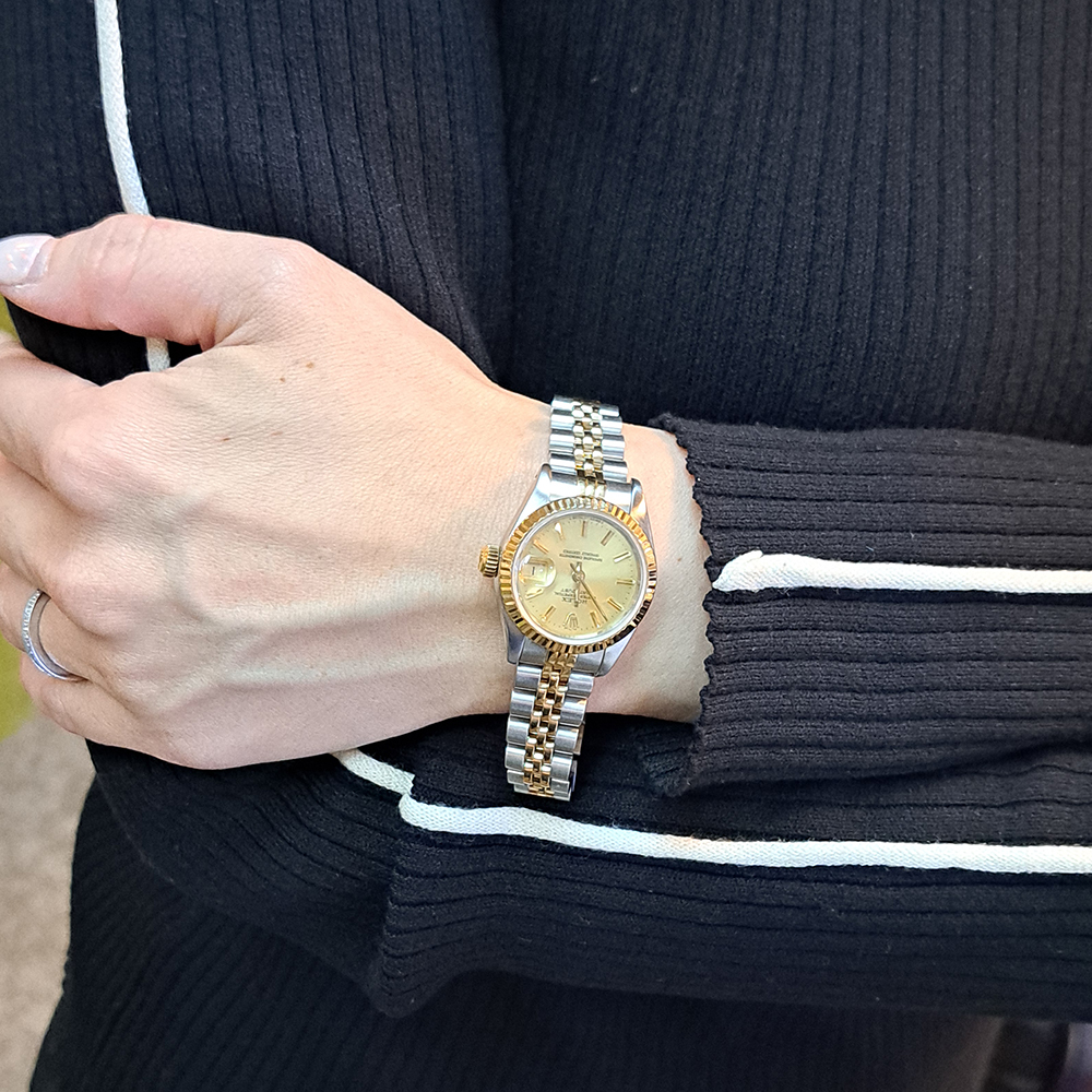 ロレックス デイトジャスト 69173 シャンパンゴールド が入荷致しました。シャンパンゴールドダイヤルにイエローゴールドとステンレススチールのコンビモデルです。ロレックス レディースの定番人気モデルのゴージャスな逸品です。こちらの商品はベルトに若干の伸びがあるのとルーペで拡大すると風防ガラスに極微細な傷が御座いますが、肉眼では殆どきにならない程度です。