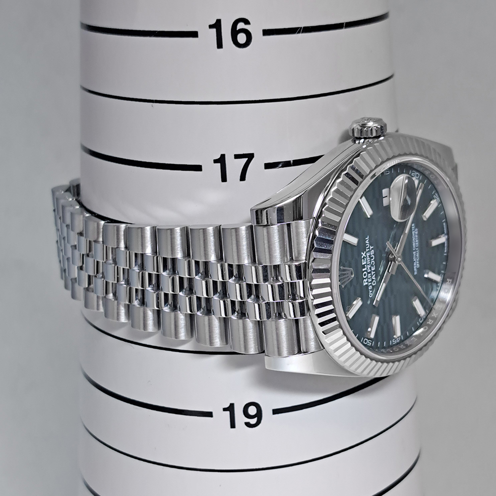 ロレックス デイトジャスト41 126334 ミント/フルーテッド ジュビリー が入荷しました。文字盤のミントグリーンのフルーテッドモチーフになっており、見る角度によって幾何学的に表情を変え、見ていて飽きのこない美しい文字盤となっております。こちらの商品は目立った傷等の無い綺麗な状態です。ギャランティに2023年に購入した記載があります。