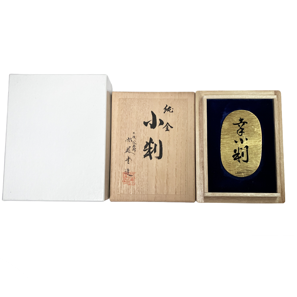 純金製 小判 大阪淀屋橋 尚美堂造が入荷しました。表面には「幸小判」の墨入れ文字、裏面には「尚美堂」「純金」と検定マークの打刻を施しています。