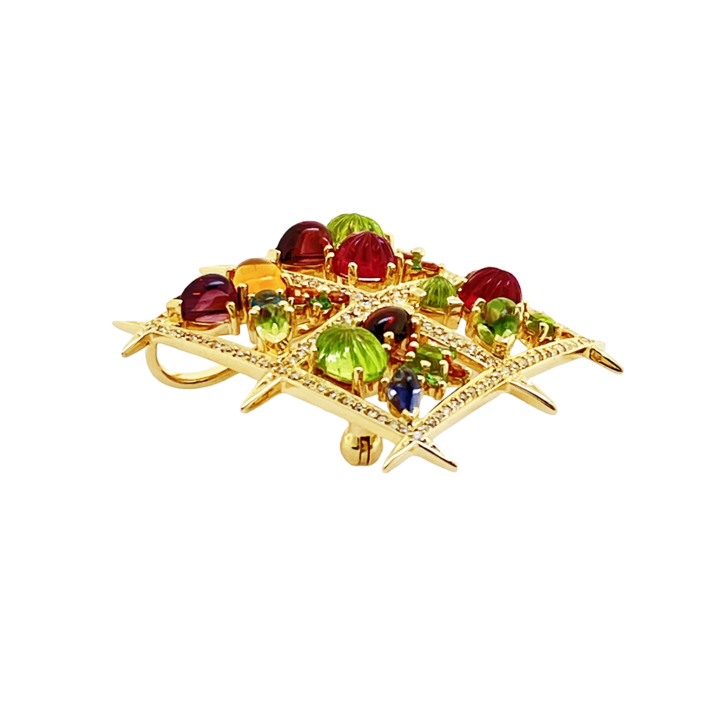 K18枠にマルチカラーストーンをセッティングしたブローチが入荷致しました。主石にピンクトルマリンを使用し、周囲にブルートパーズ、ベリドット、シトリン、アイオライト、ガーネット(パープル、オレンジ)、グリーングロッシュラーガーネット、ダイヤモンドを贅沢にセッティングした豪華なお品です。