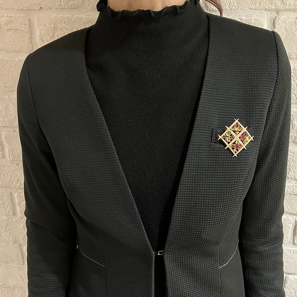 カラフルな石がセッティングされており、ゴージャスで華やかな印象を与えてくれるブローチです。ペンダントトップとしてもご使用いただけます。※装着写真のチェーンは別売です。