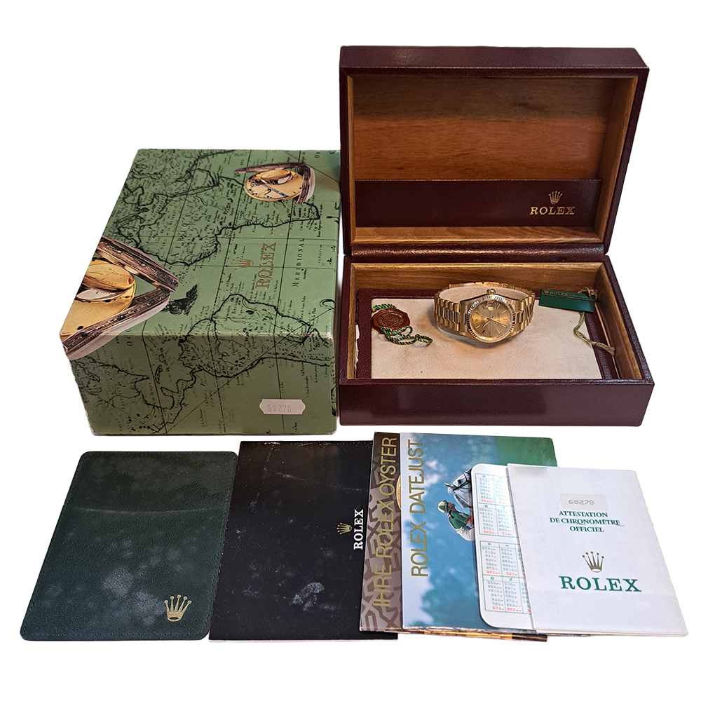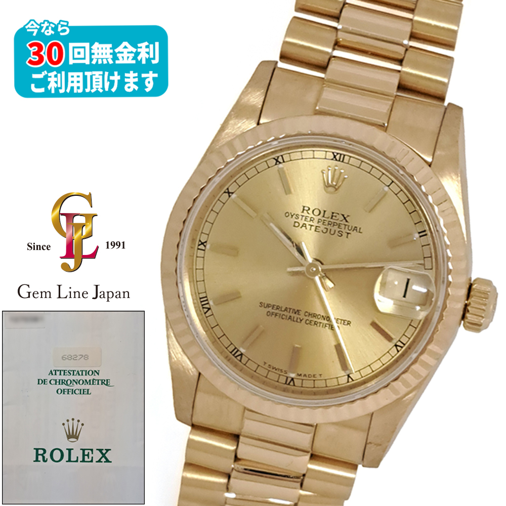 ロレックス デイトジャスト 68278 ボーイズ 金無垢 が入荷致しました。ロレックスの定番人気モデルで金無垢素材に小振りながらも煌びやかでしっかりとした存在感のある一本です。ギャランティに1996年10月にバーレーンにて購入した記載があります。ベルトに若干の伸びがありますが、ご使用には問題ございません。ルーペで拡大すると風防ガラスに微細なカケがありますが、肉眼では殆ど気にならない程度です。2026年2月に当社提携工房にてオーバーホールを実施しており、安心してご使用して頂けます。