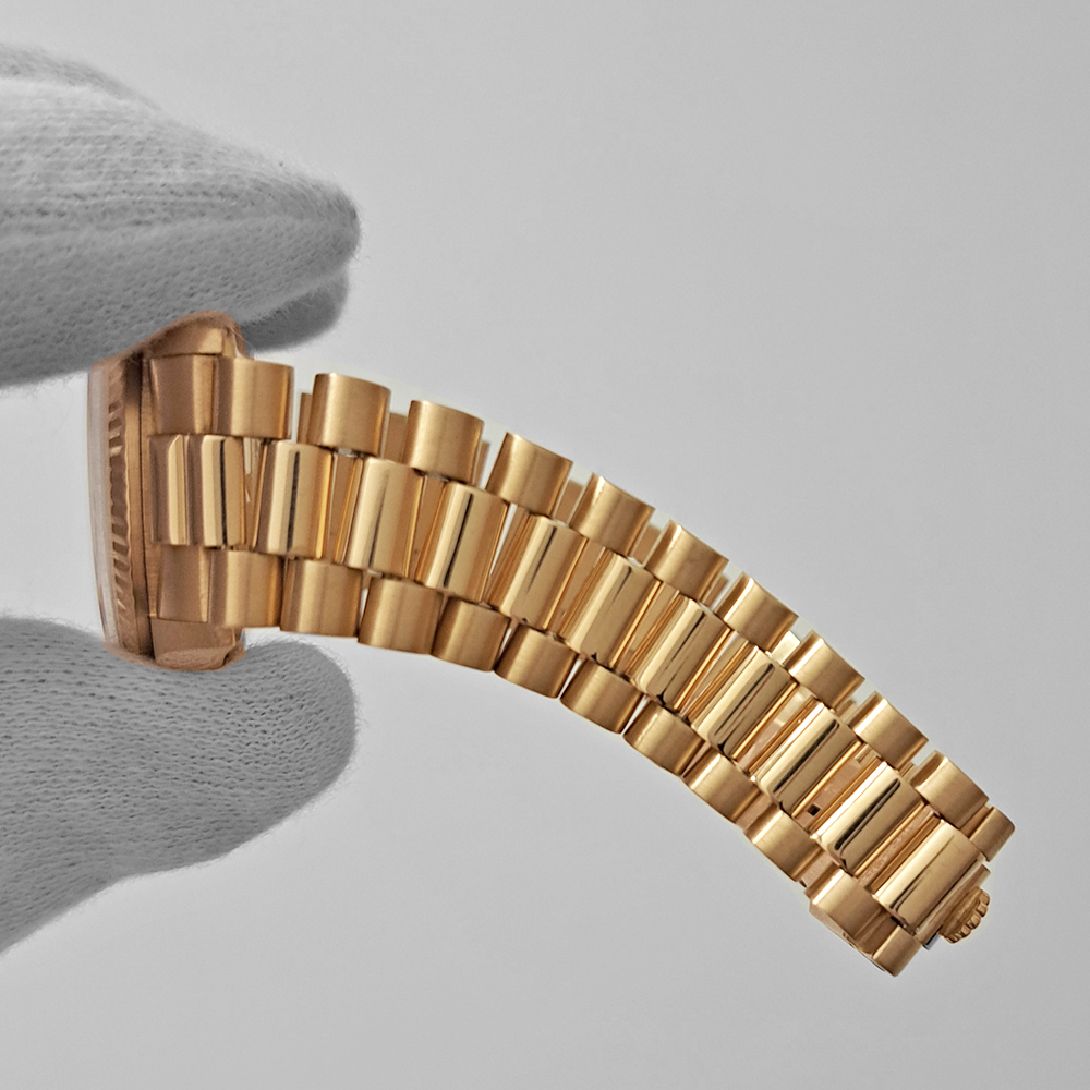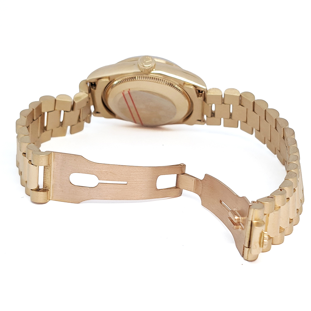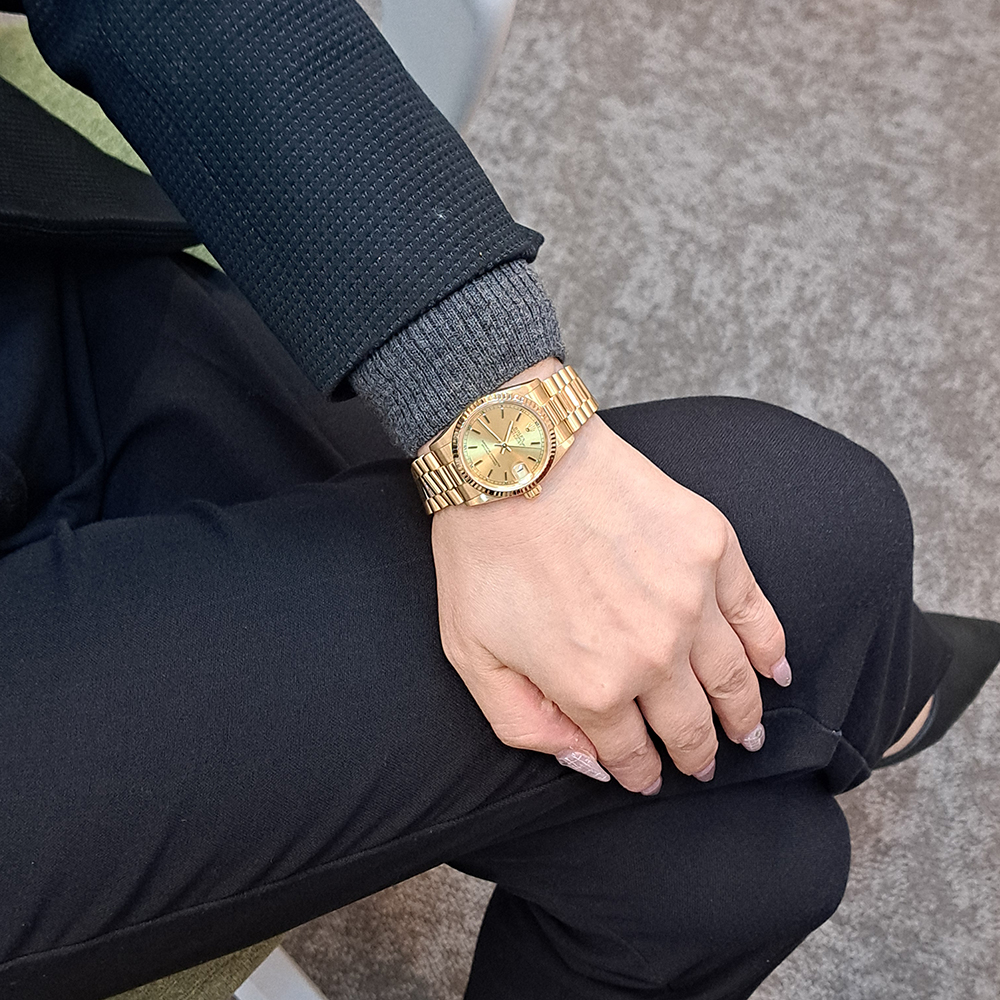 シャンパンダイヤルはイエローゴールドの無垢ケース・ブレスに対して非常に相性が良く、全体の統一感が強く引き立ち、腕回りをゴージャスに演出してくれます。