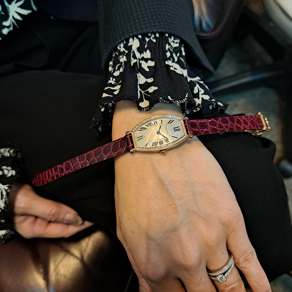 カルティエ トノー WE400331 ピンクゴールドが入荷致しました。ピンクゴールド無垢素材にベゼルにはびっしりとダイヤモンドをセッティングしたゴージャスなモデルです。当店提携工房にて制作した別作のクロコダイルベルトとの相性も抜群です。ギャランティに2007年12月に韓国にて購入した記載があります。こちらの商品は目立った傷等の無い綺麗な状態です。