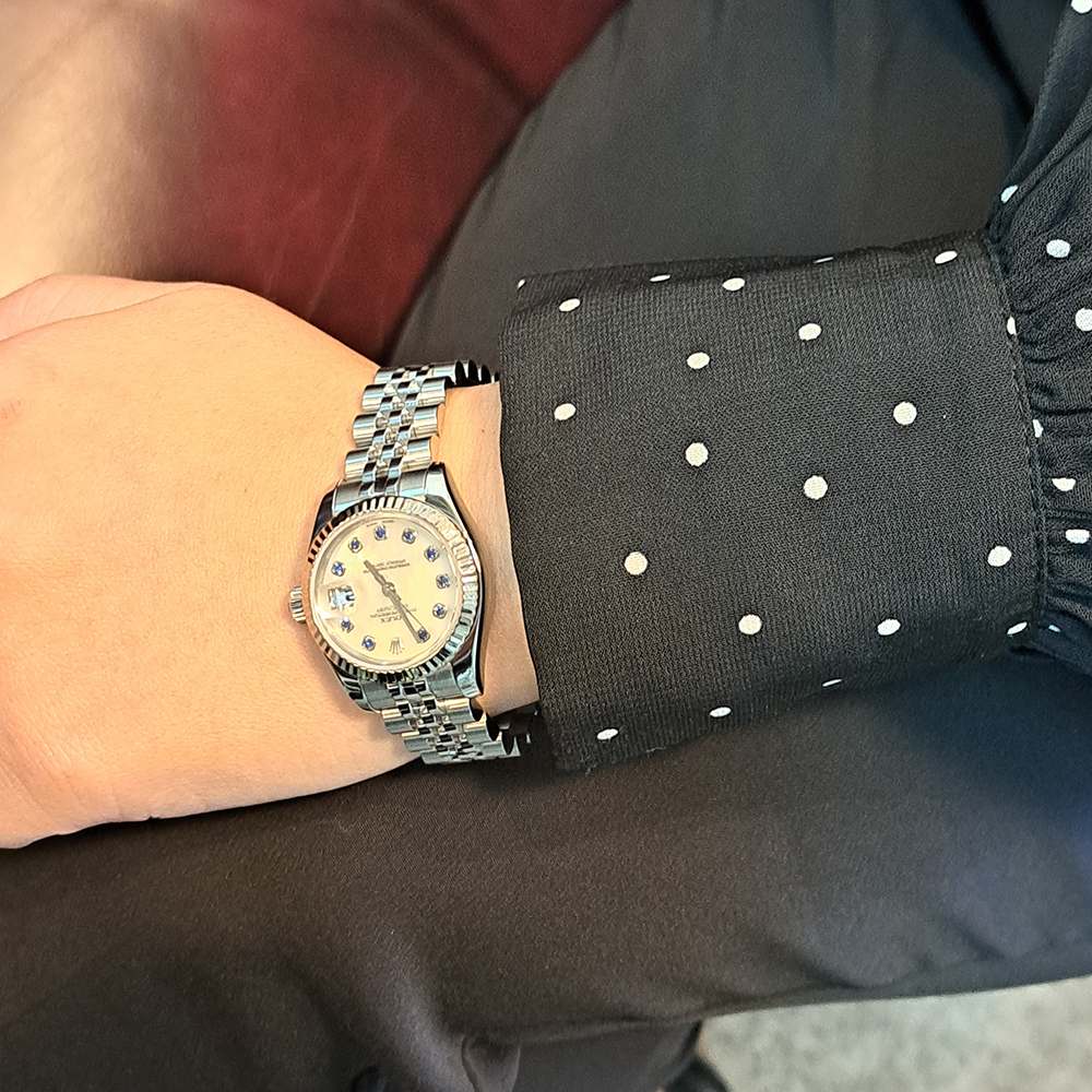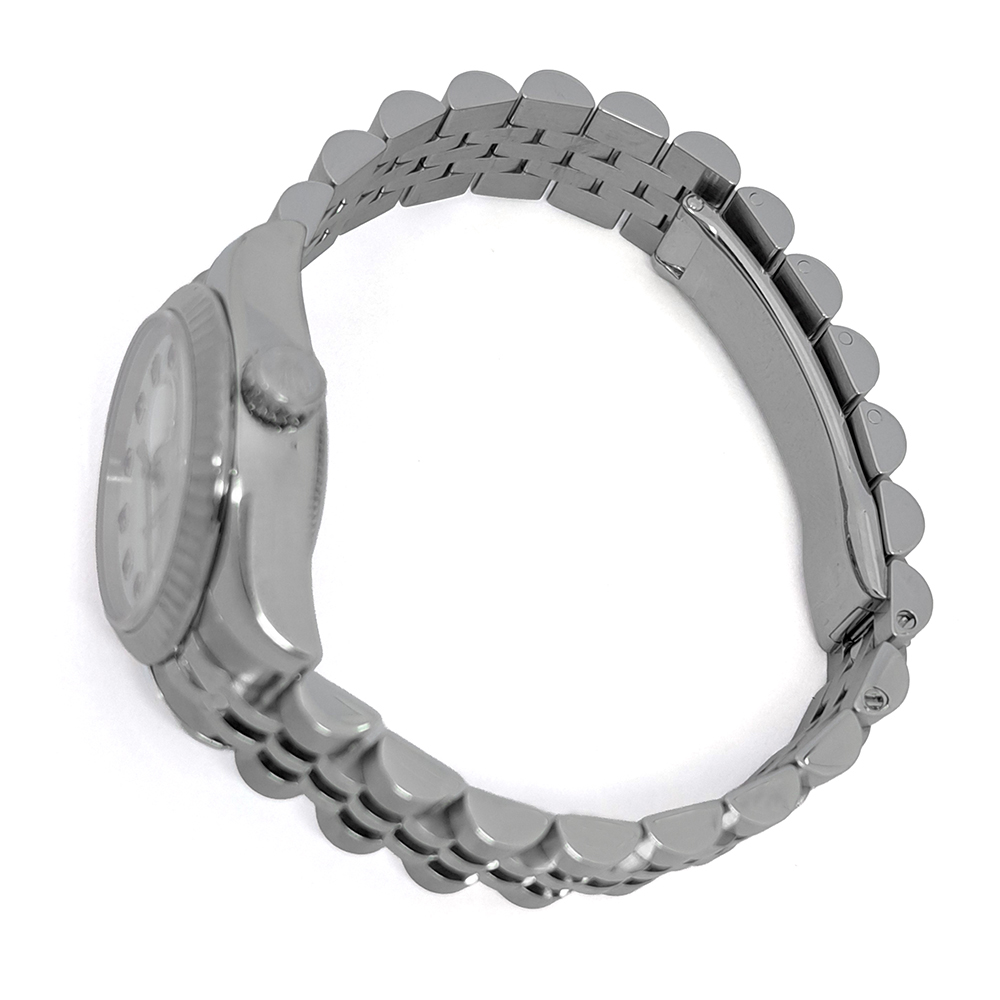 ダイヤモンドインデックスが主流の中で179174NGSはサファイアインデックスとホワイトシェルダイヤルを組み合わせた市場に余り見かけない珍しいタイプのモデルです。サファイアの深みのある青とシェルの輝きがは、他人と被りにくい特別なレディース時計をお探しの方にお勧めです。
