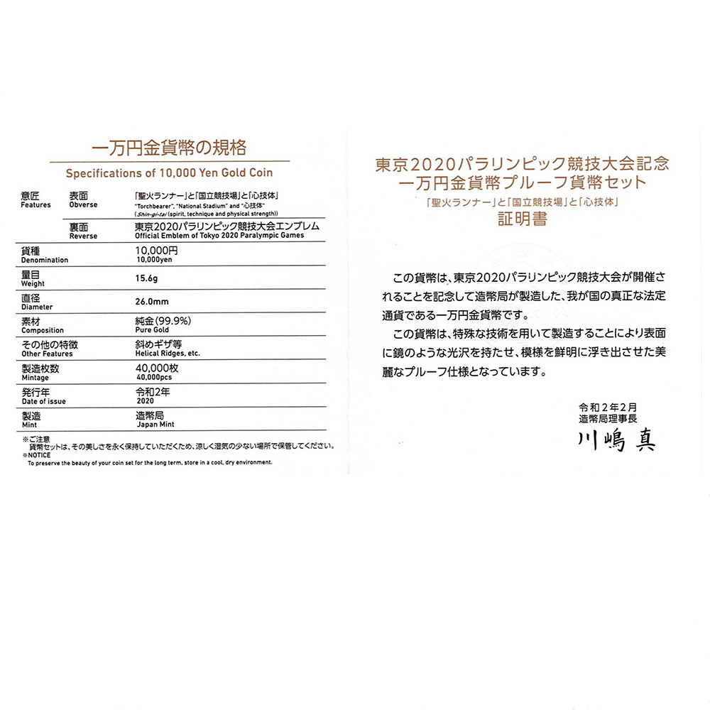 15.60g 【未使用】純金製 K24 2020東京パラリンピック競技大会記念 1万円 プルーフ金貨