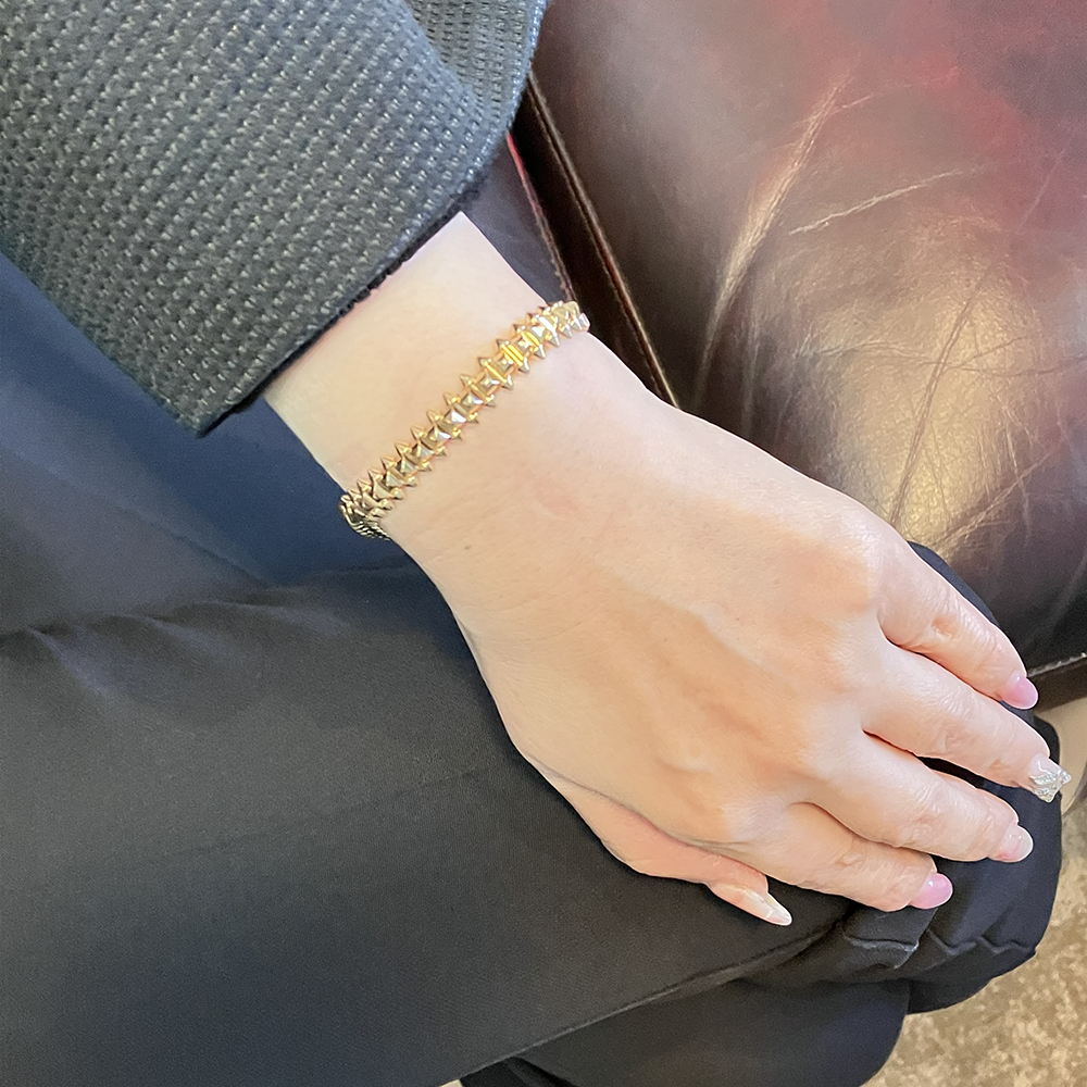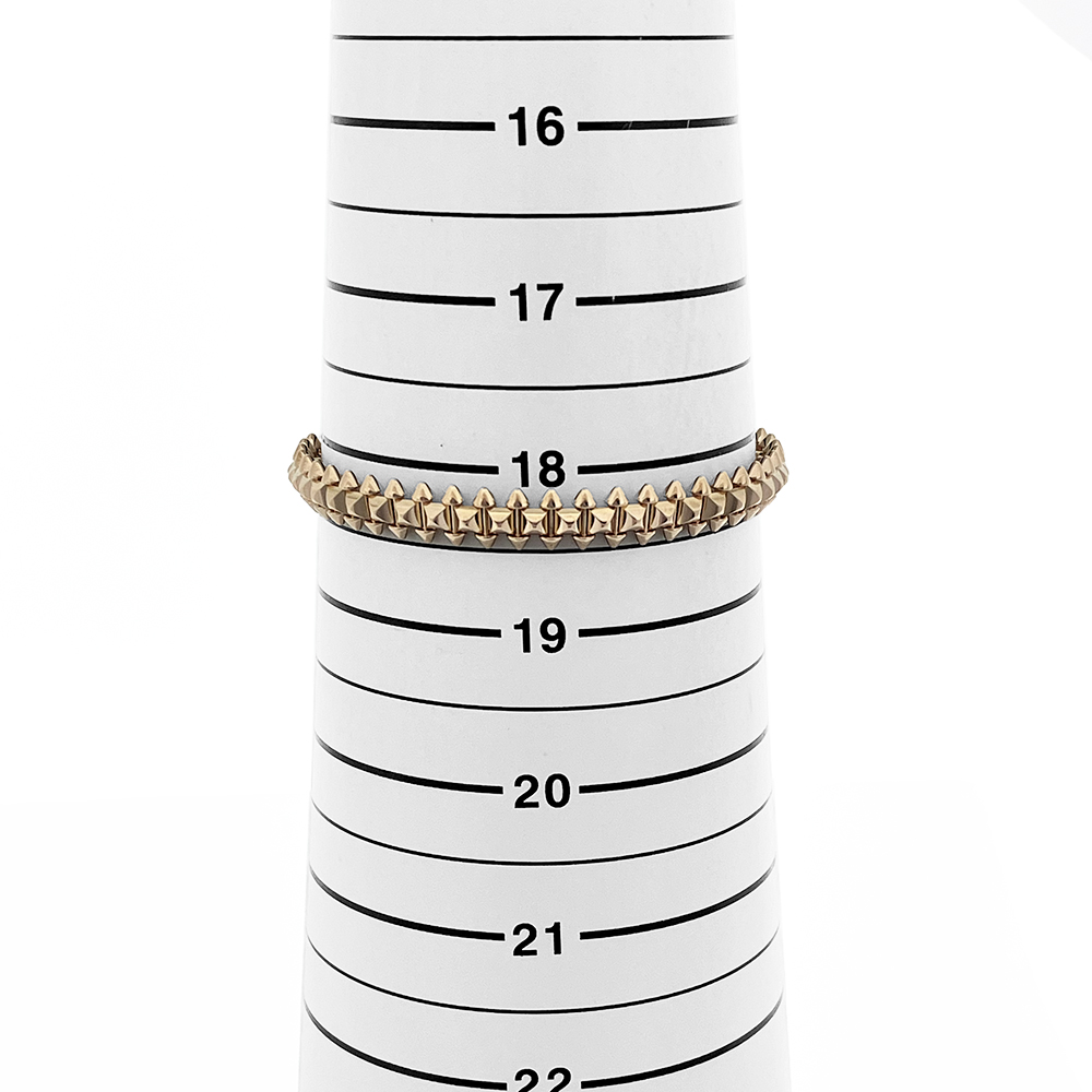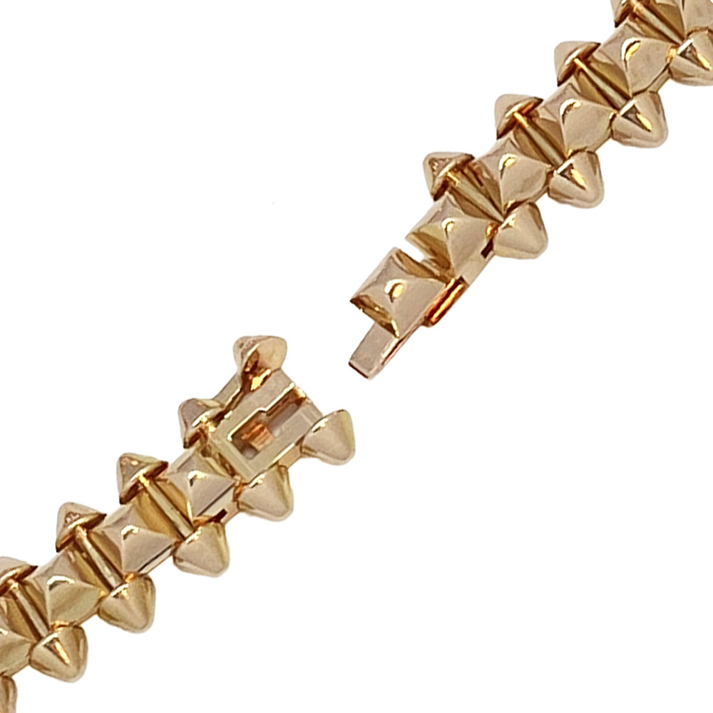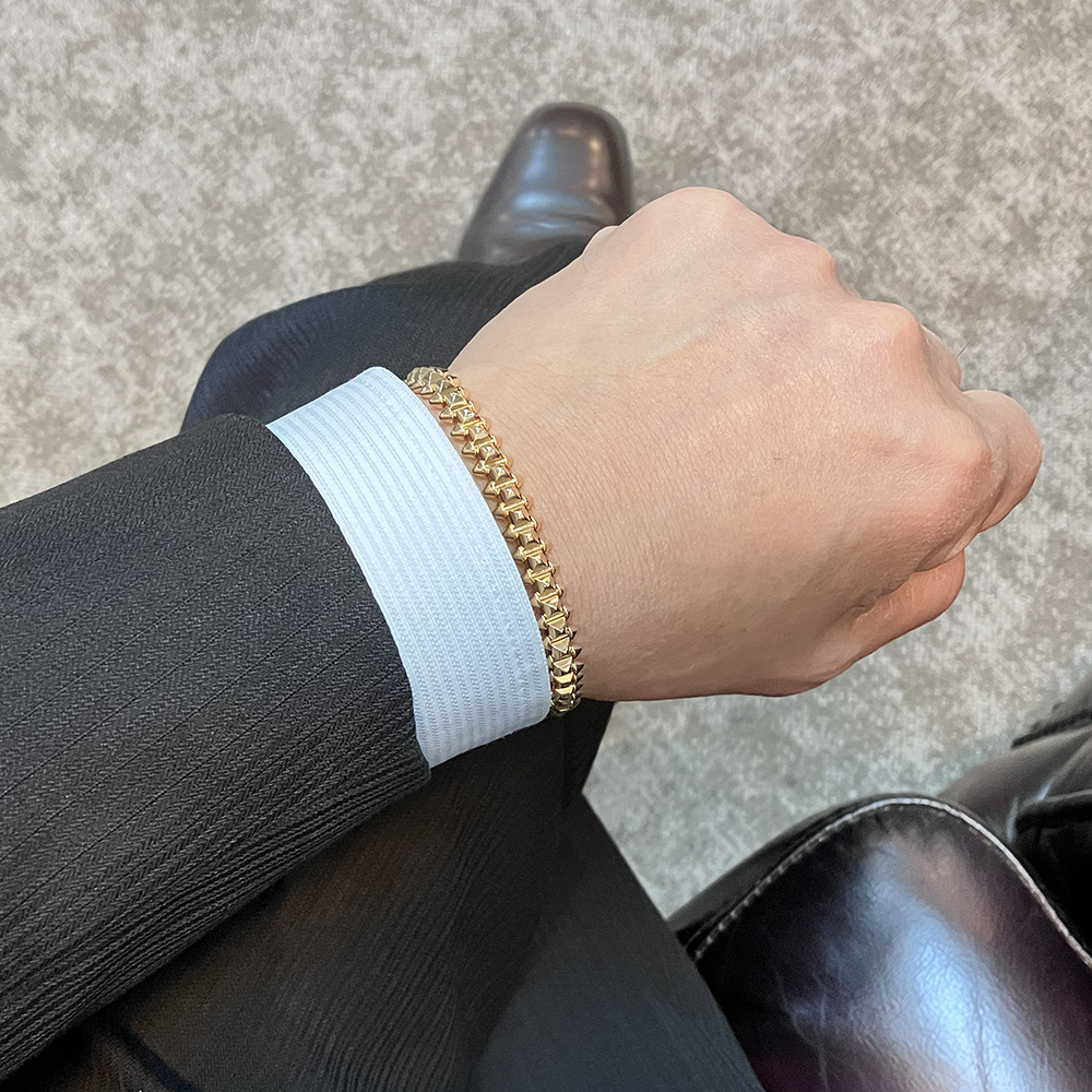 フランス語で“スクエア(正方形)”を意味する「カレ」から生まれたカルティエの象徴的なコードのひとつ「クル カレ」がライン中央に並び、その両サイドにあしらわれた「ピコ」と呼ばれる円錐状のスタッズと幾何学的なデザインコントラストを描く、カルティエ独特のデザインのブレスレットです。 装着すると着け心地が最高です。普段使いにもご使用になれます。男性の方にもおすすめです。