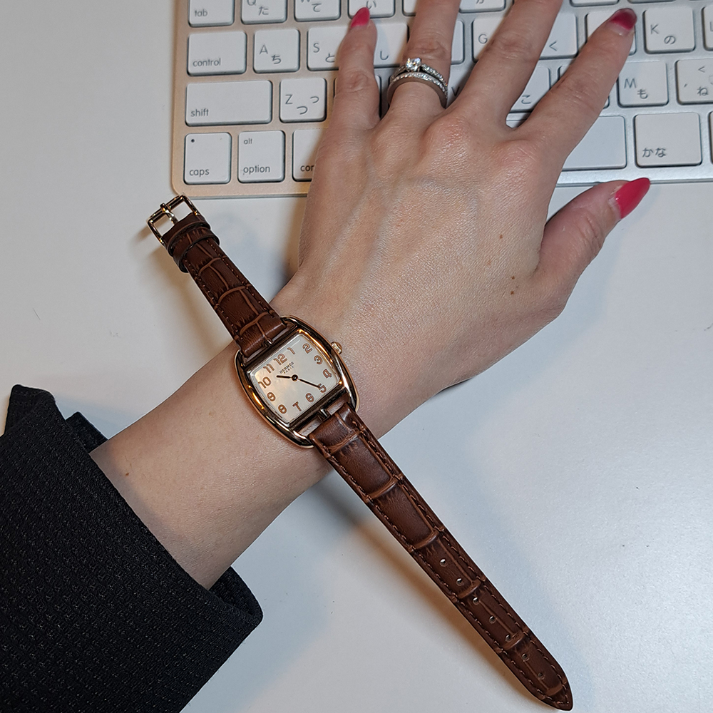 ホワイトシェル文字盤は光の当たる角度により色んな表情を楽しんで頂ける時計です。丸みを帯びたケースは柔らかなデザインとなっておりエルメスのバッグ等と合わせて身に着けてみてはいかがでしょうか?