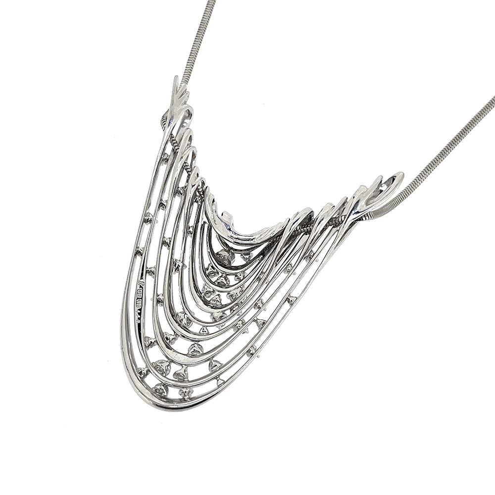 RIZ Jewelry K18WG ダイヤモンド ネックレス が入荷しました。リッツは1993年創業のジュエリーブランド。銀座のアトリエから生み出されるオリジナルジュエリーは素材えらび・デザインの細部へのこだわり、着けごこちを追及し続けています。こちらは柔らかな帯が連なって垂れ下がったような美しいデザインに上質なダイヤモンドが散りばめられた非常にエレガントなお品です。