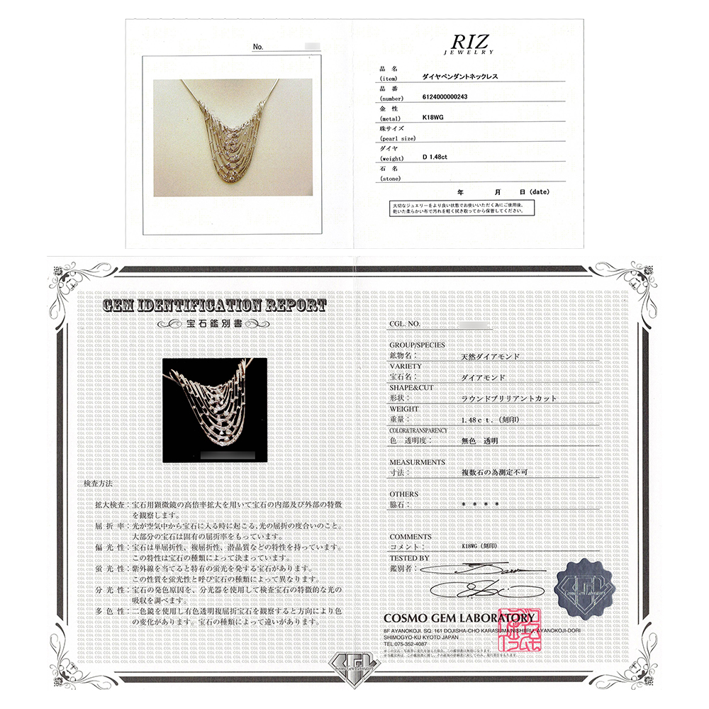 RIZ Jewelry K18WG ダイヤモンド 1.48ct デザイン ネックレス 保証書・鑑別書付