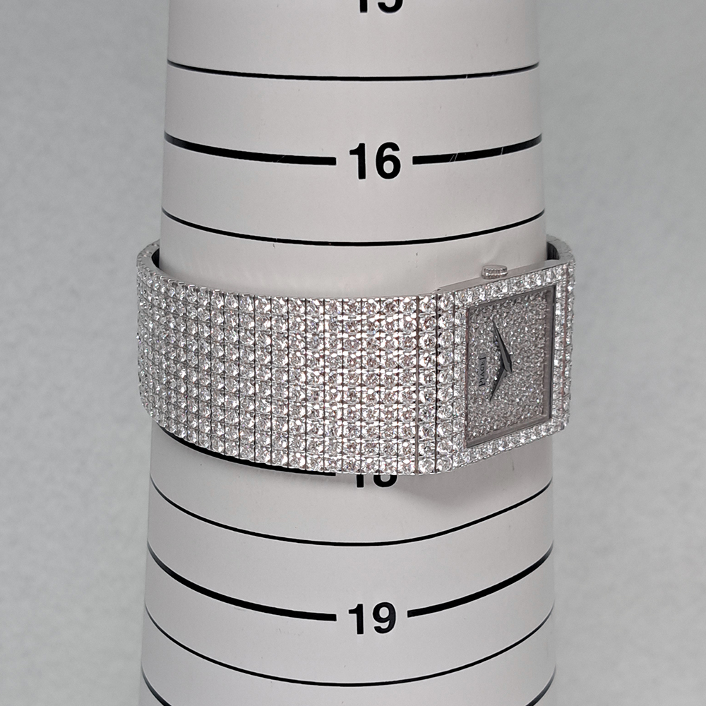 ピアジェ ライムライト HJ GOLD BRACELET が入荷致しました。ホワイトゴールド素材にケースからベルト、ダイヤルまで全面にダイヤモンドが施されたピアジェの最高級モデルです。最大の特徴である全面のダイヤモンドが光を受けてきらきらと輝き腕元をゴージャスに演出してくれます。こちらの商品は目立った傷等のない綺麗な状態です。メーカーにて2026年4月にオーバーホールも実施しておりますので、安心してご使用して頂けます。