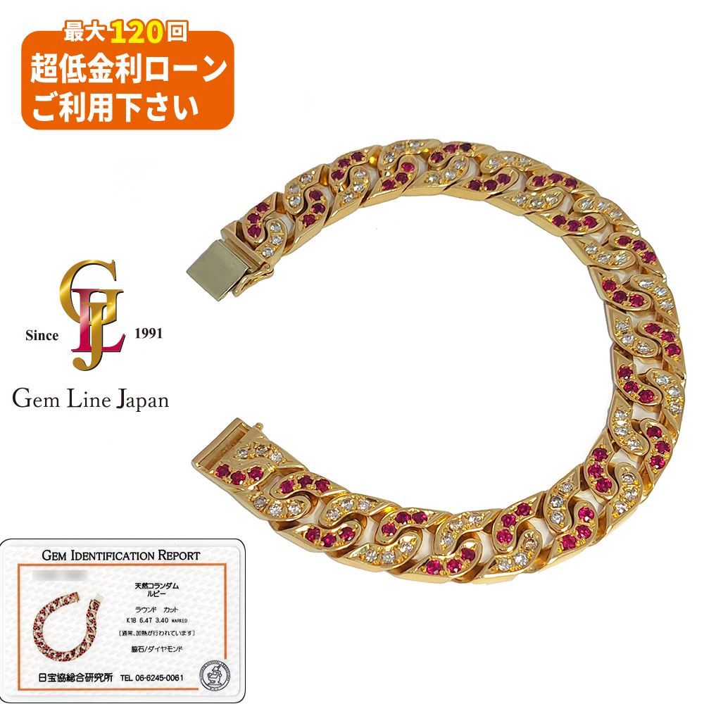 K18 88.32g ルビー 6.47ct ダイヤモンド 3.40ct メンズ デザイン ブレスレット 日宝協カード鑑付